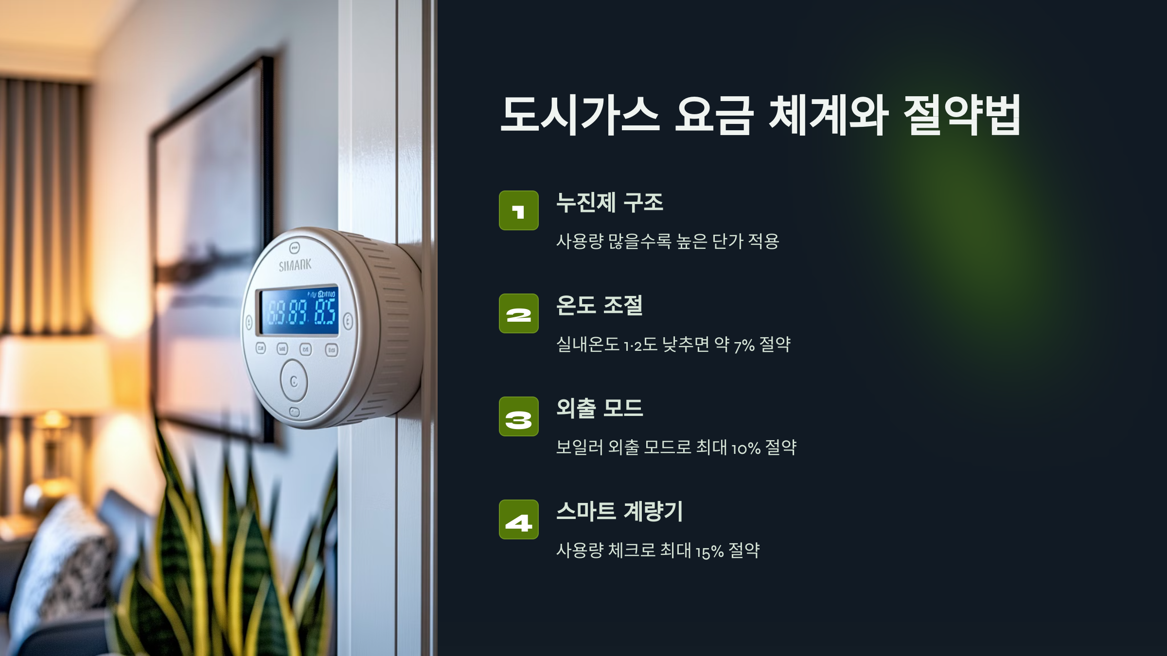 도시가스 요금은 기본요금과 사용량에 따른 단가로 구성돼요. 사용량이 많아질수록 높은 단가가 적용되는 '누진제'가 있어요. 따라서 가스 사용량을 줄이는 것이 난방비 절감의 핵심이에요.