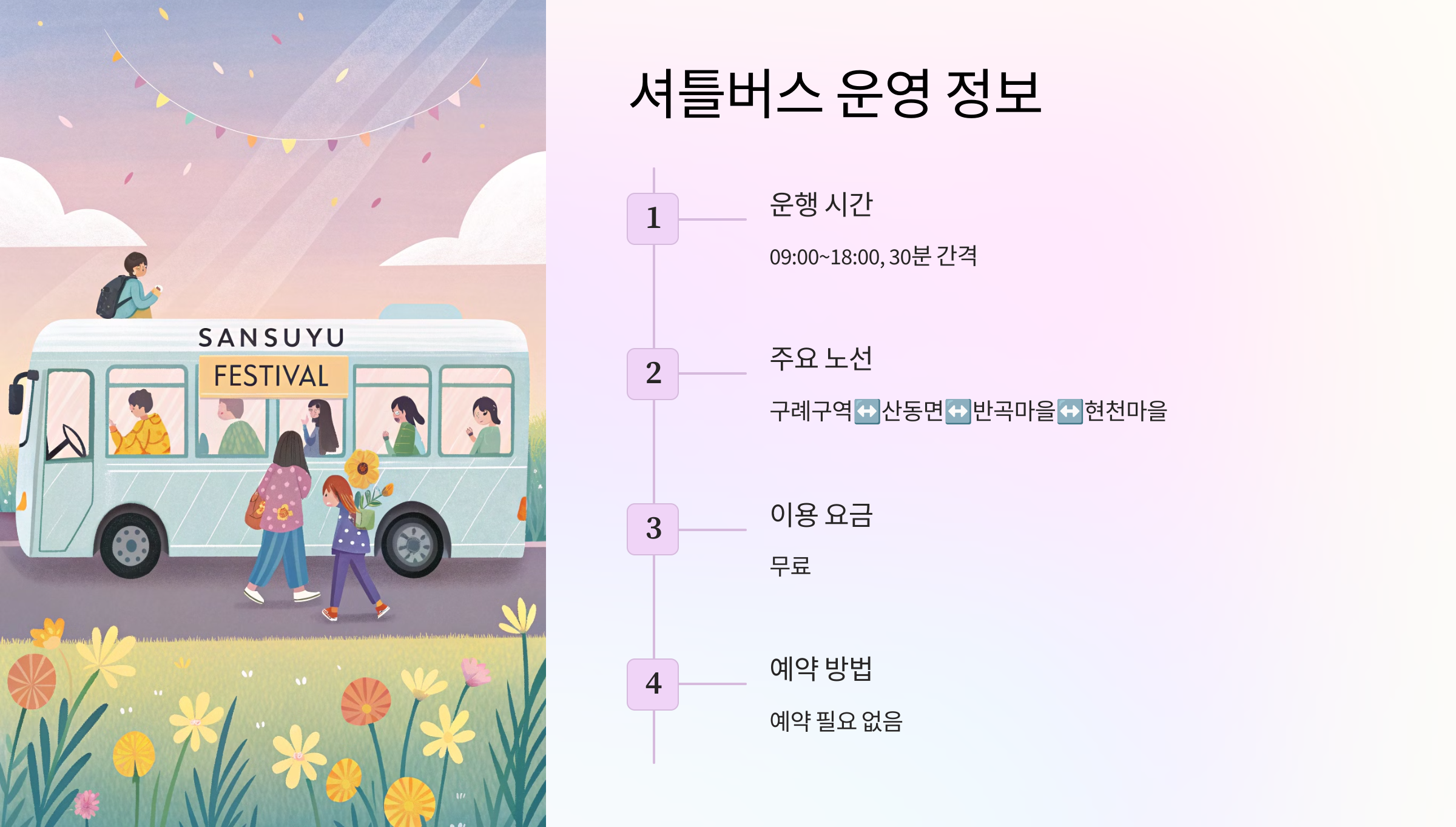 셔틀버스 노선은 구례구역 ↔ 산동면 ↔ 반곡마을 ↔ 현천마을로 이어지며, 모든 주요 포인트에 정차해요. 셔틀을 이용하면 이동이 편리하고 주차 스트레스도 없어요!