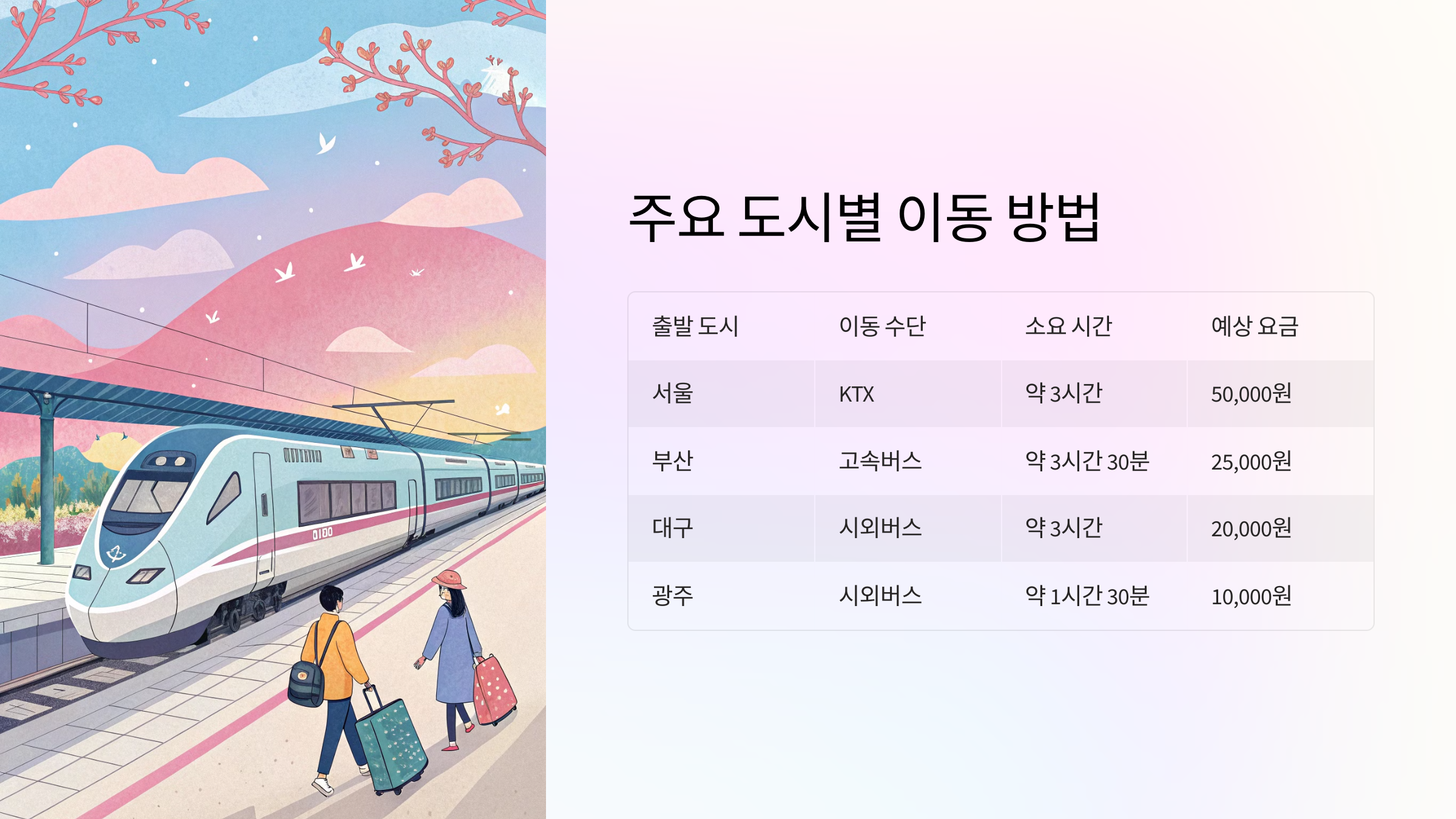 🚍 주요 도시 출발 교통편 비교표