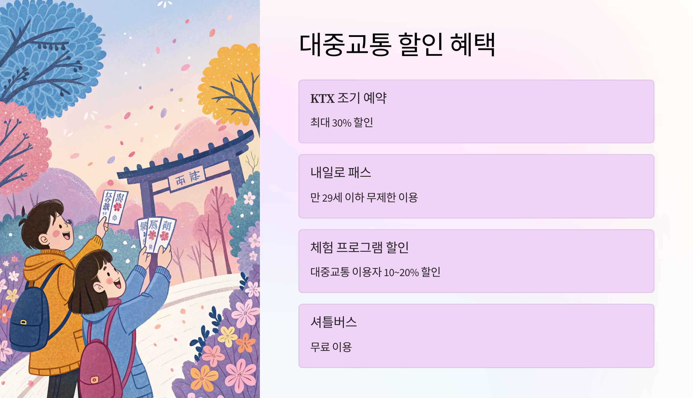 특히 KTX 이용 시 미리 예매하면 할인 혜택을 받을 수 있으니 꼭 확인해 보세요! 🎫😊