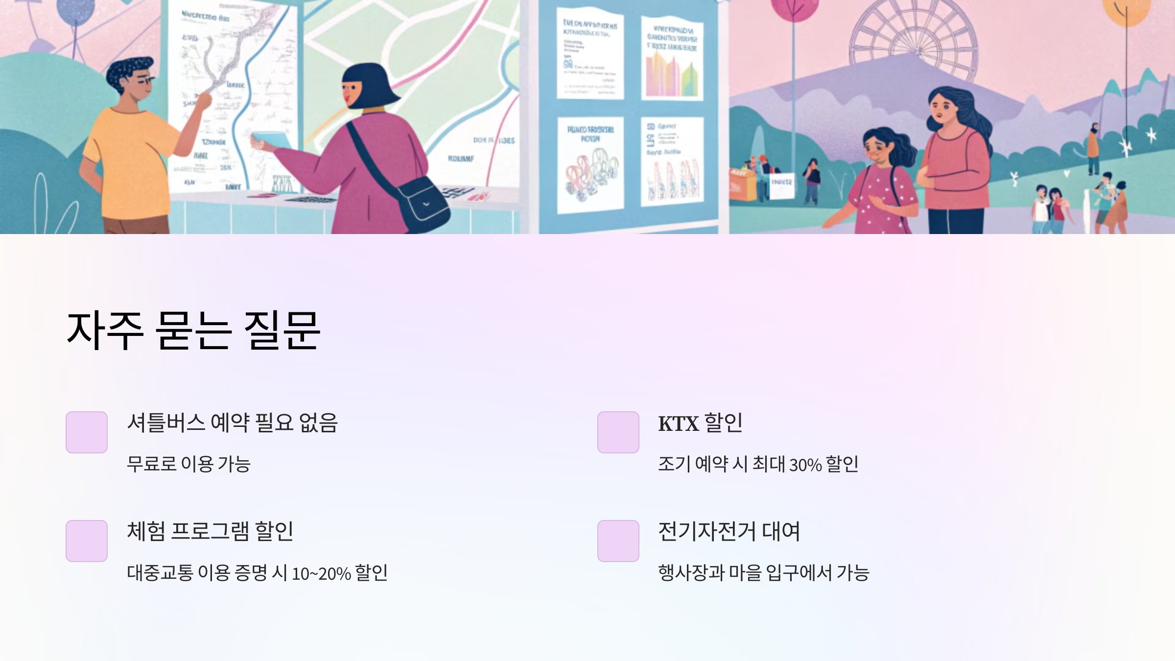 A3. 대중교통 이용 영수증을 제시하면 일부 체험 프로그램에서 10% ~ 20% 할인 혜택을 받을 수 있어요.