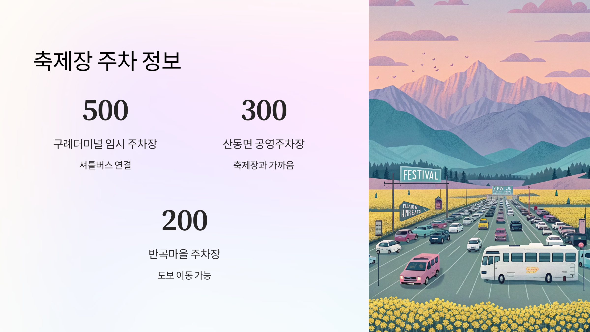 | 산동면 공영주차장 | 약 300대 | 무료 | 축제장과 가까움 |