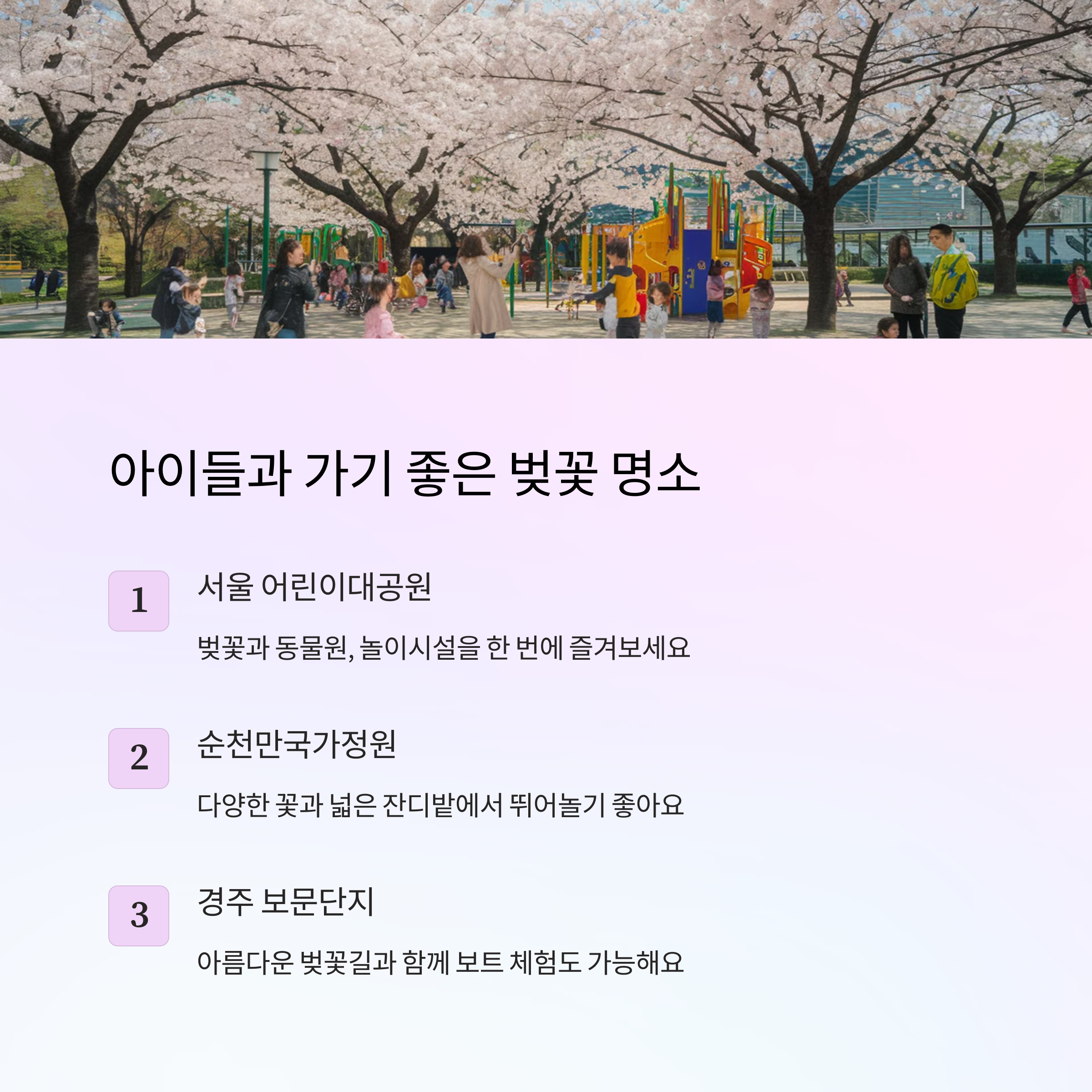 각 지역마다 아이들과 함께 즐기기 좋은 벚꽃 명소가 많으니, 가까운 곳을 선택해 편안한 나들이를 떠나 보세요! 😊