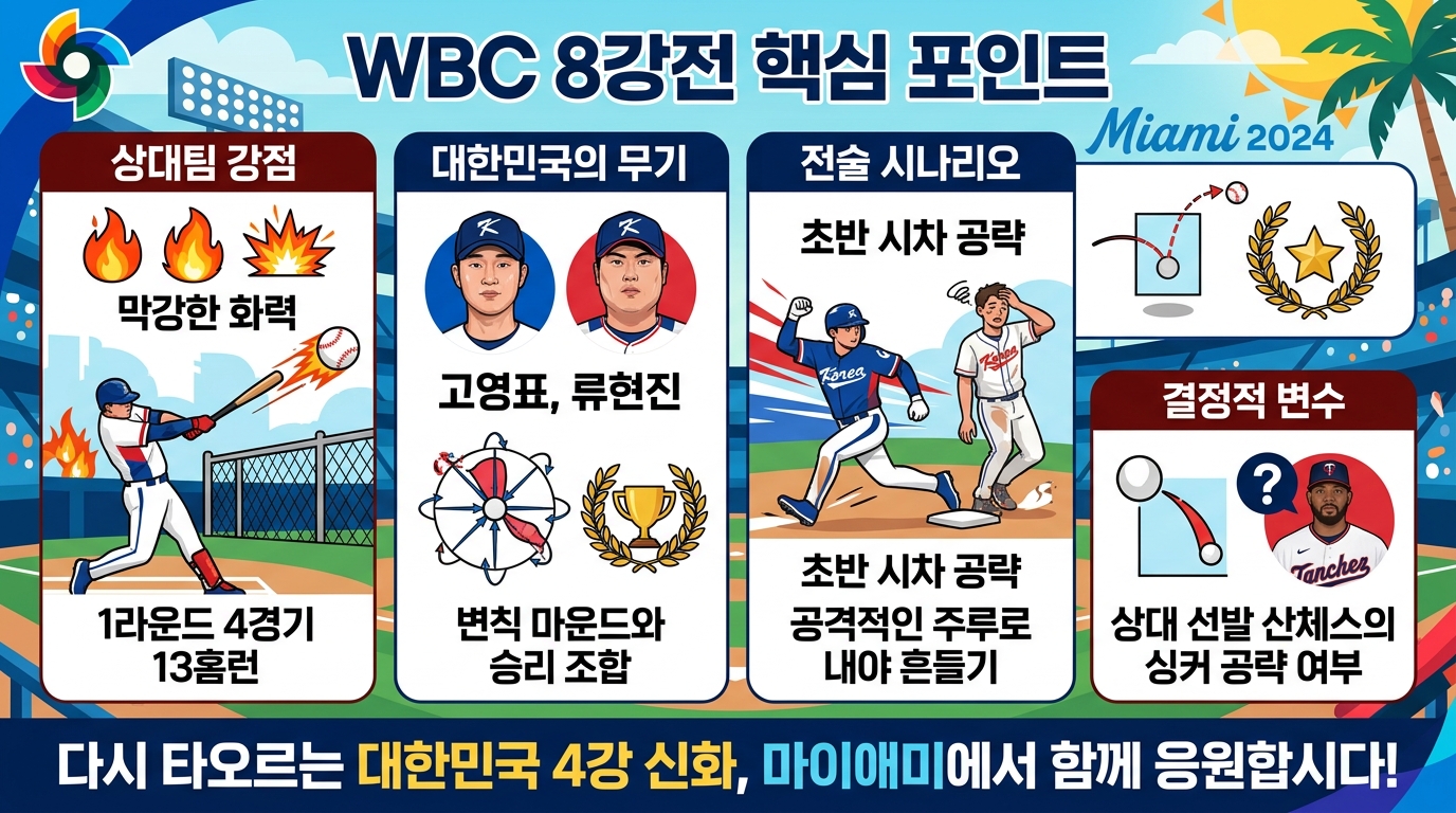 골리앗과 마주 선 다윗의 심정이 이럴까요? 하지만 한국 야구는 위기 속에서 늘 더 강해졌습니다. 17년 만에 찾아온 기회, 우리 선수들이 마이애미의 뜨거운 태양 아래서 마음껏 기량을 펼치길 응원합니다. 여러분이 생각하는 8강전 '미친 선수'는 누구인가요? 류현진의 노련함일까요, 아니면 김도영의 한 방일까요? 여러분의 예측을 댓글로 공유해 주세요! 😊