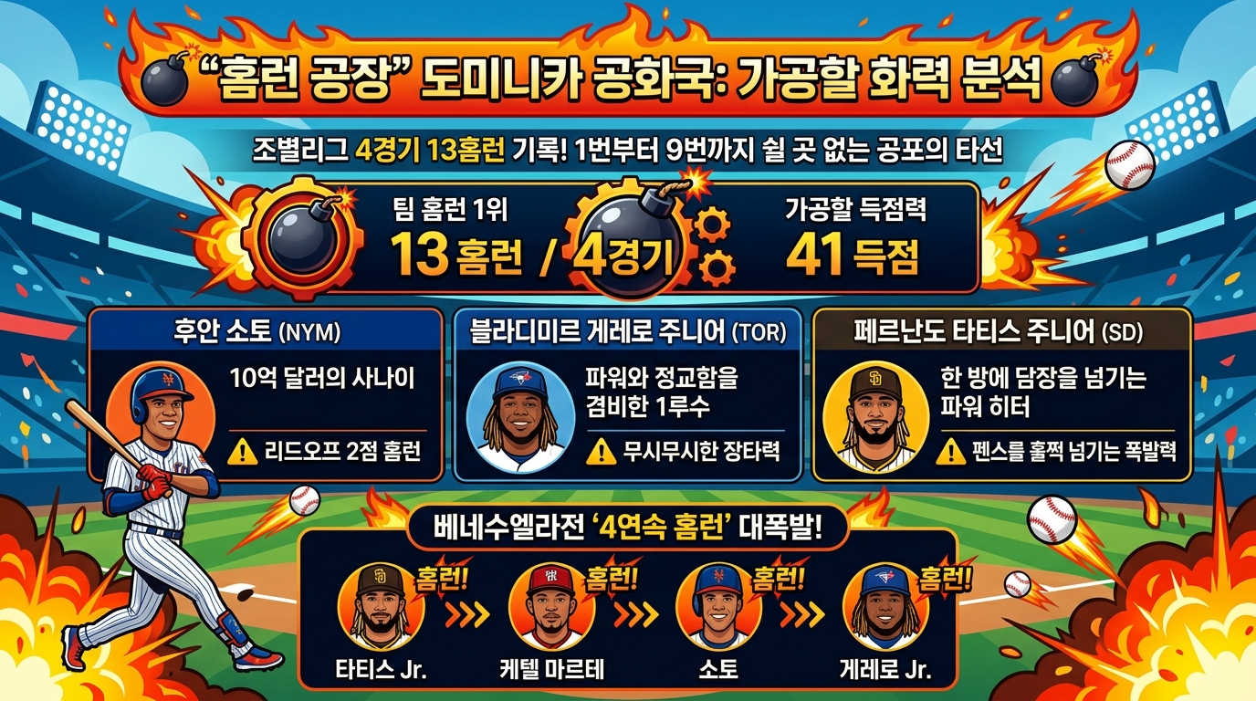 도미니카 공화국 타선은 한마디로 '빈틈이 없는 홈런 공장'입니다. 조별리그 4경기에서만 무려 13개의 홈런을 터뜨리며 전체 팀 홈런 1위에 올랐습니다. 1번부터 9번까지 어느 한 명 쉬어갈 타자가 없다는 게 우리 투수진에게는 가장 큰 공포입니다.