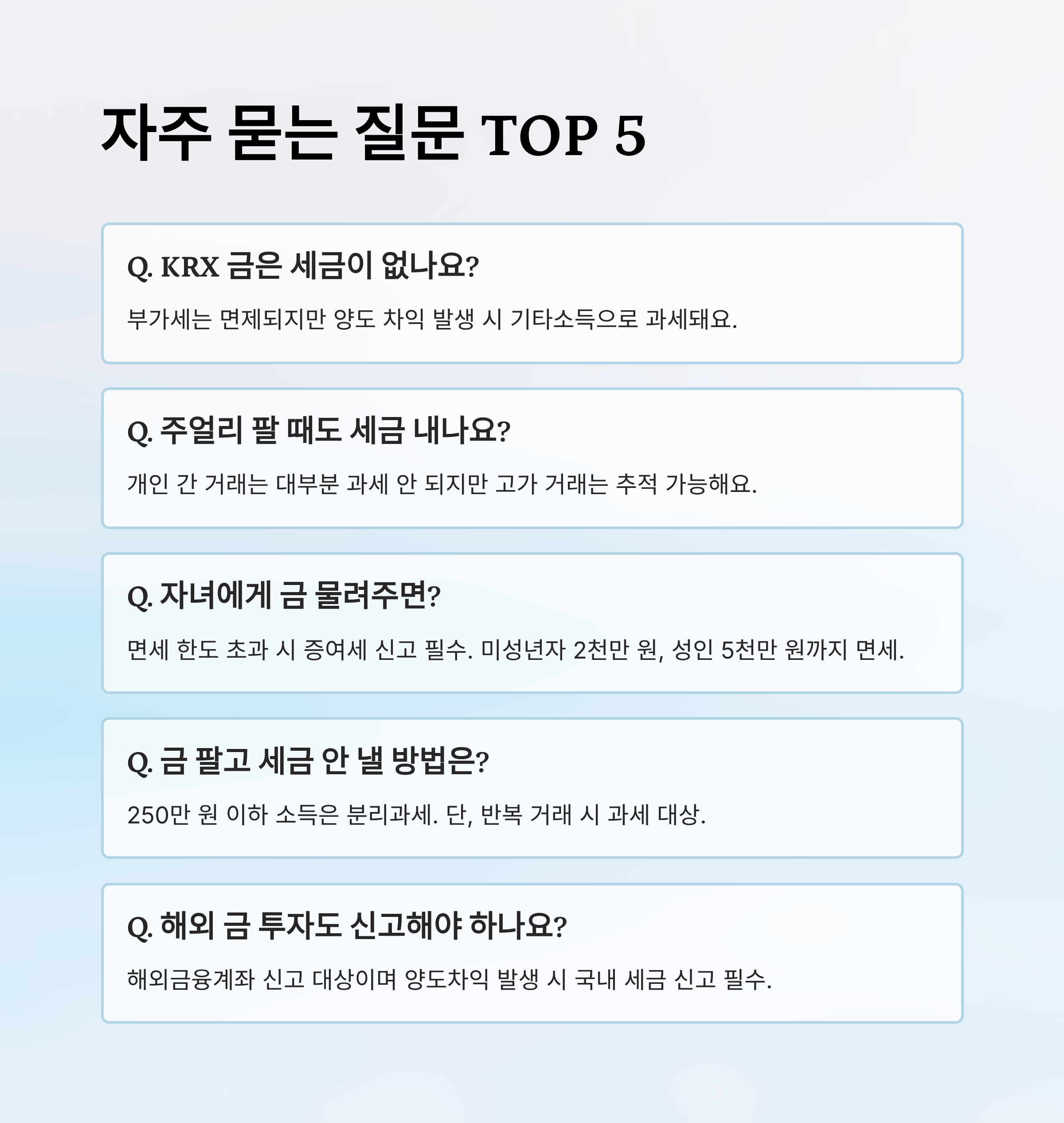 이러한 배경을 이해하고 있어야 ‘세금 폭탄’을 피할 수 있어요. 특히 내가 생각했을 때, 단순히 “금은 사놓으면 오르겠지”라는 생각은 이제 너무 위험하다고 느껴져요. 투자 전에 반드시 세금 구조를 먼저 이해하고 시작하는 게 현명한 선택이에요.