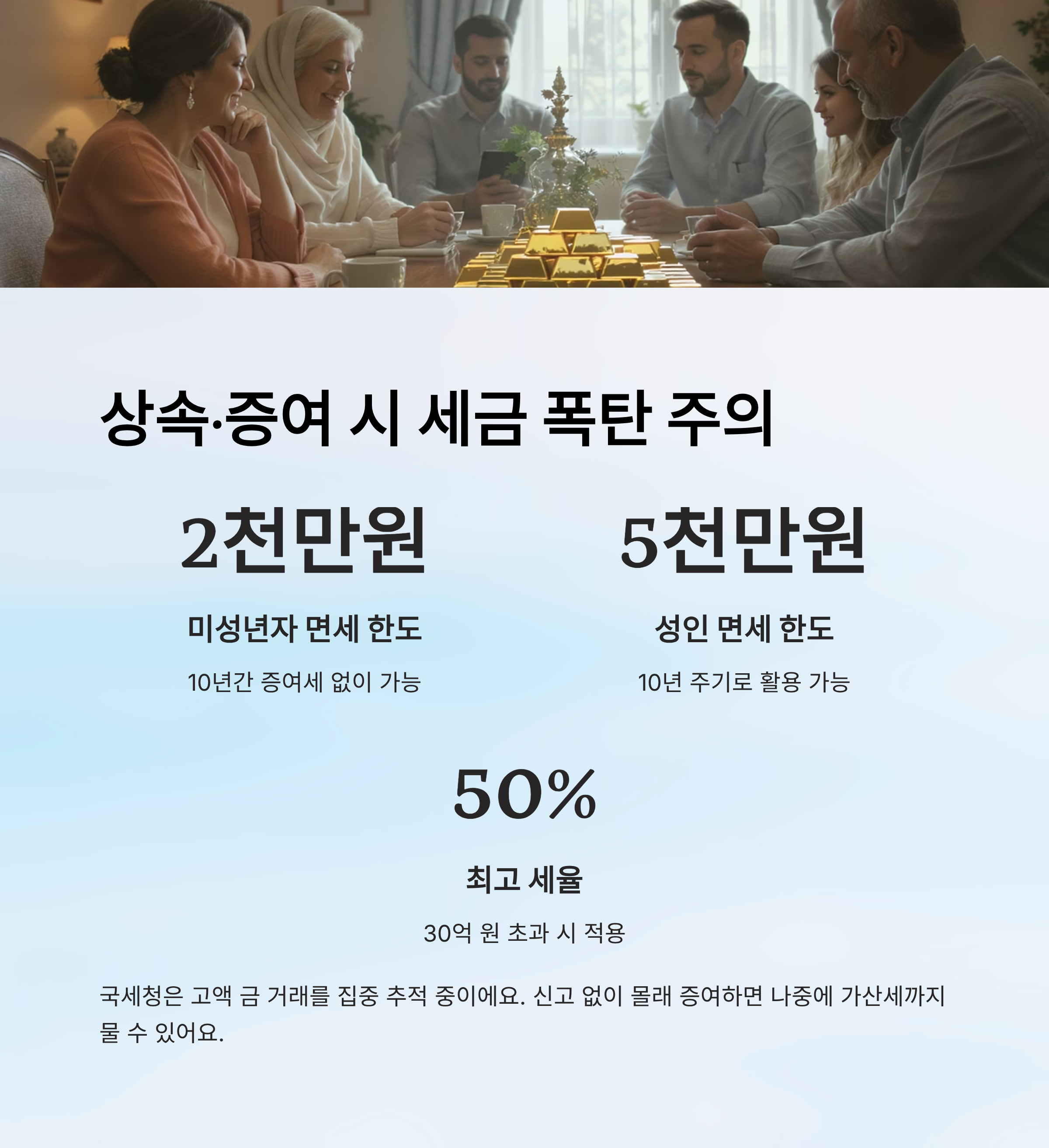 또한 가족 간 금 증여를 계획하고 있다면, 10년 단위 면세 한도를 최대한 활용하는 것이 중요해요. 자녀에게 한 번에 몰아서 주는 대신 10년 주기로 나눠서 증여하면 과세 부담을 줄일 수 있어요. 성인의 경우 5천만 원, 미성년자는 2천만 원까지는 세금 없이 증여가 가능하니까요.