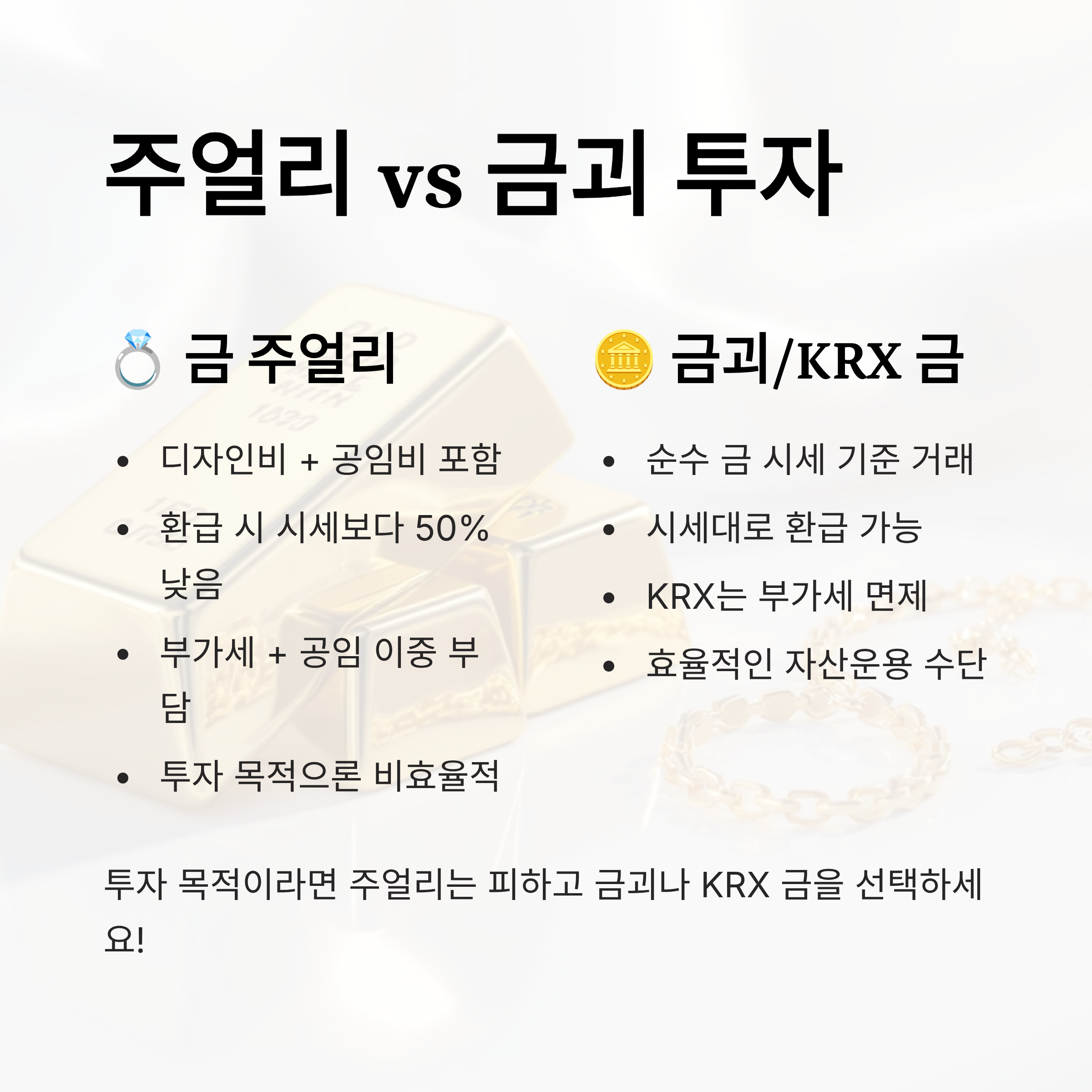 | 금반지·주얼리 | 과세 + 공임비 | 투자용 부적합 |