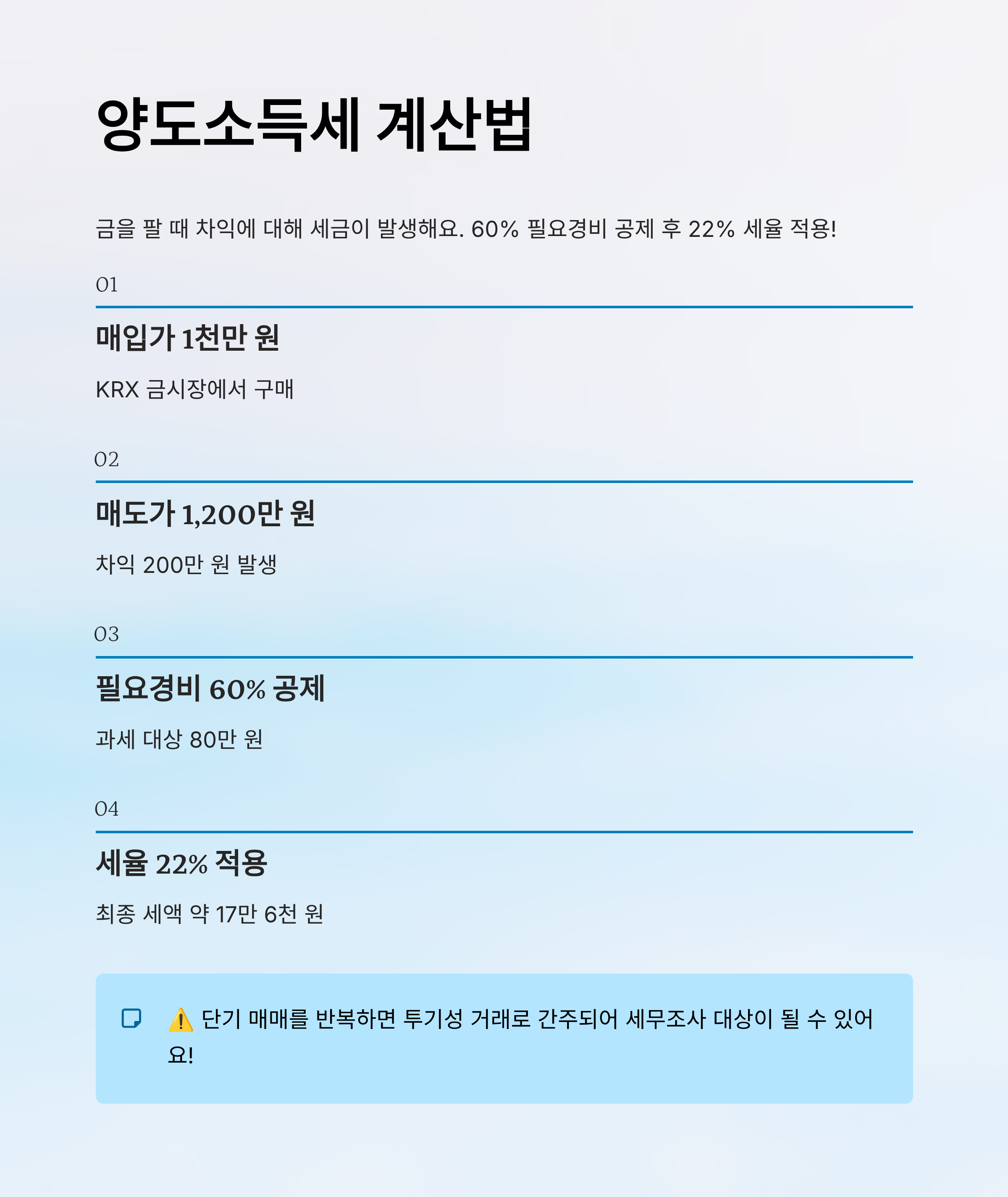 예를 들어, KRX 금시장에서 1천만 원어치 금을 샀다가 나중에 1,200만 원에 팔았다면, 차익 200만 원에 대해 세금이 부과돼요. 이때 60%를 필요경비로 공제받을 수 있어서 과세 대상은 80만 원이 돼요. 여기에 22%의 세율을 적용하면, 약 17만 6천 원 정도 세금이 나오는 구조예요.