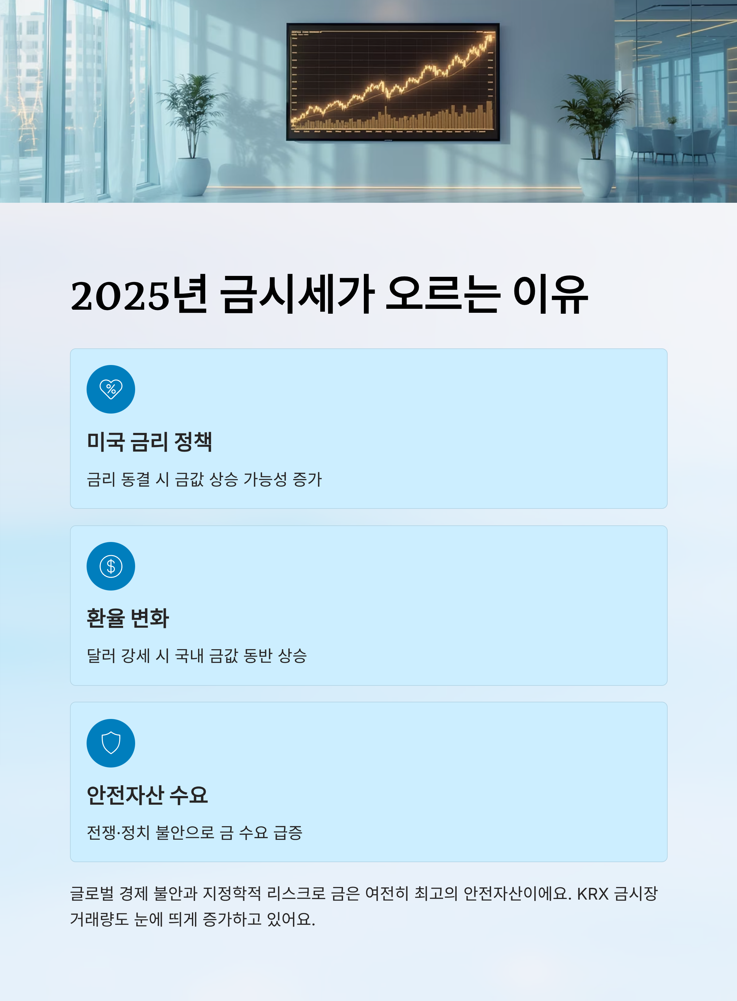 2025년 현재, 금값은 글로벌 인플레이션, 환율 불안정성, 지정학적 리스크로 인해 지속적인 상승세를 보이고 있어요. 특히 미국의 기준금리 변동과 연준의 긴축 정책, 유럽 및 중동 지역의 불안정한 정치 상황이 금 가격에 영향을 주고 있죠. 이 때문에 금은 여전히 ‘안전자산’으로 주목받고 있어요.