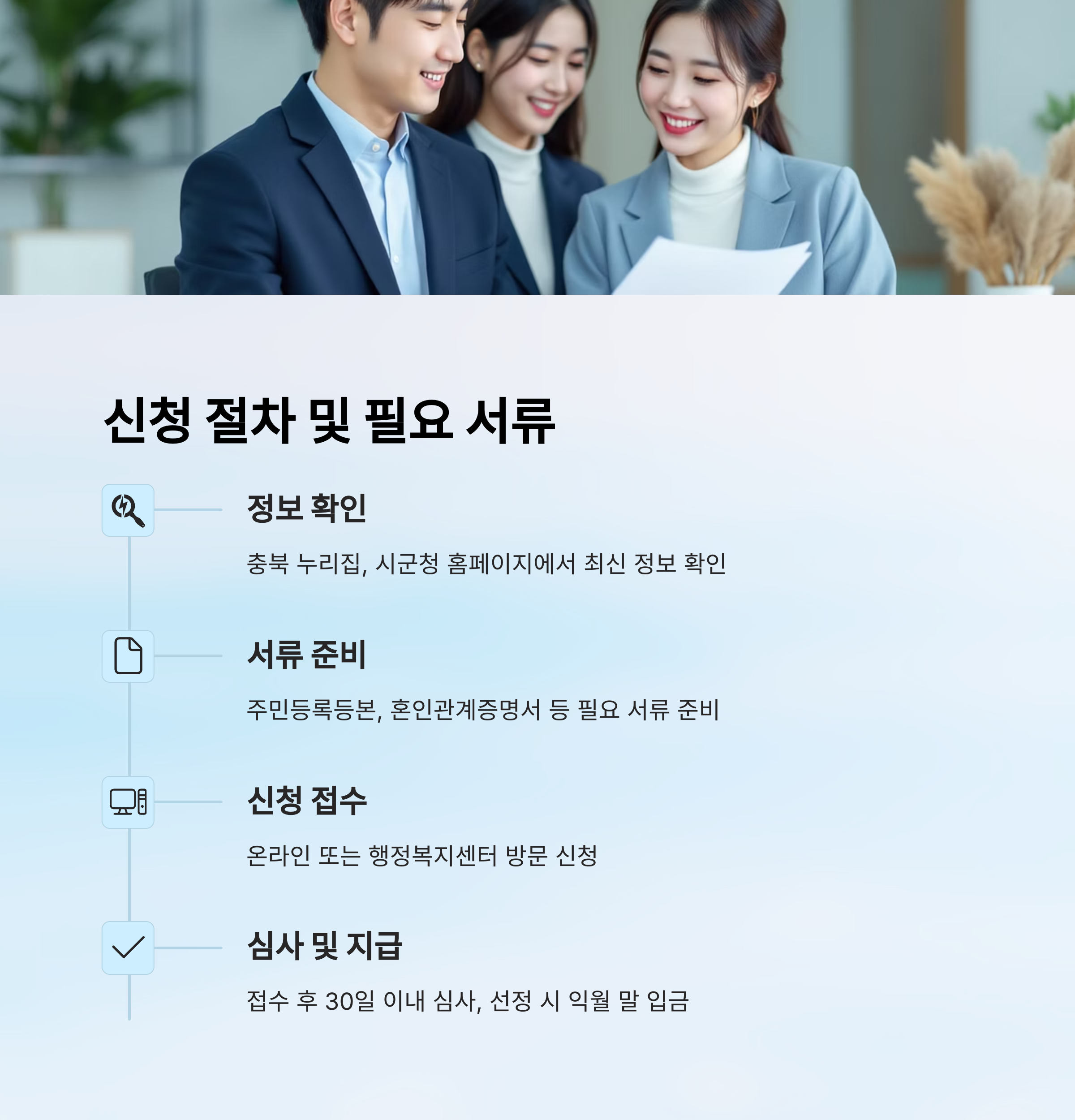 지원대상은 만 19세 이상부터 만 39세 이하인 청년 신혼부부이며, 신청일 기준으로 부부 중 한 명 이상이 충청북도에 6개월 이상 주민등록이 되어 있어야 해요. 중요한 조건 중 하나는 혼인신고일이 2025년 1월 1일 이후여야 한다는 점이에요.