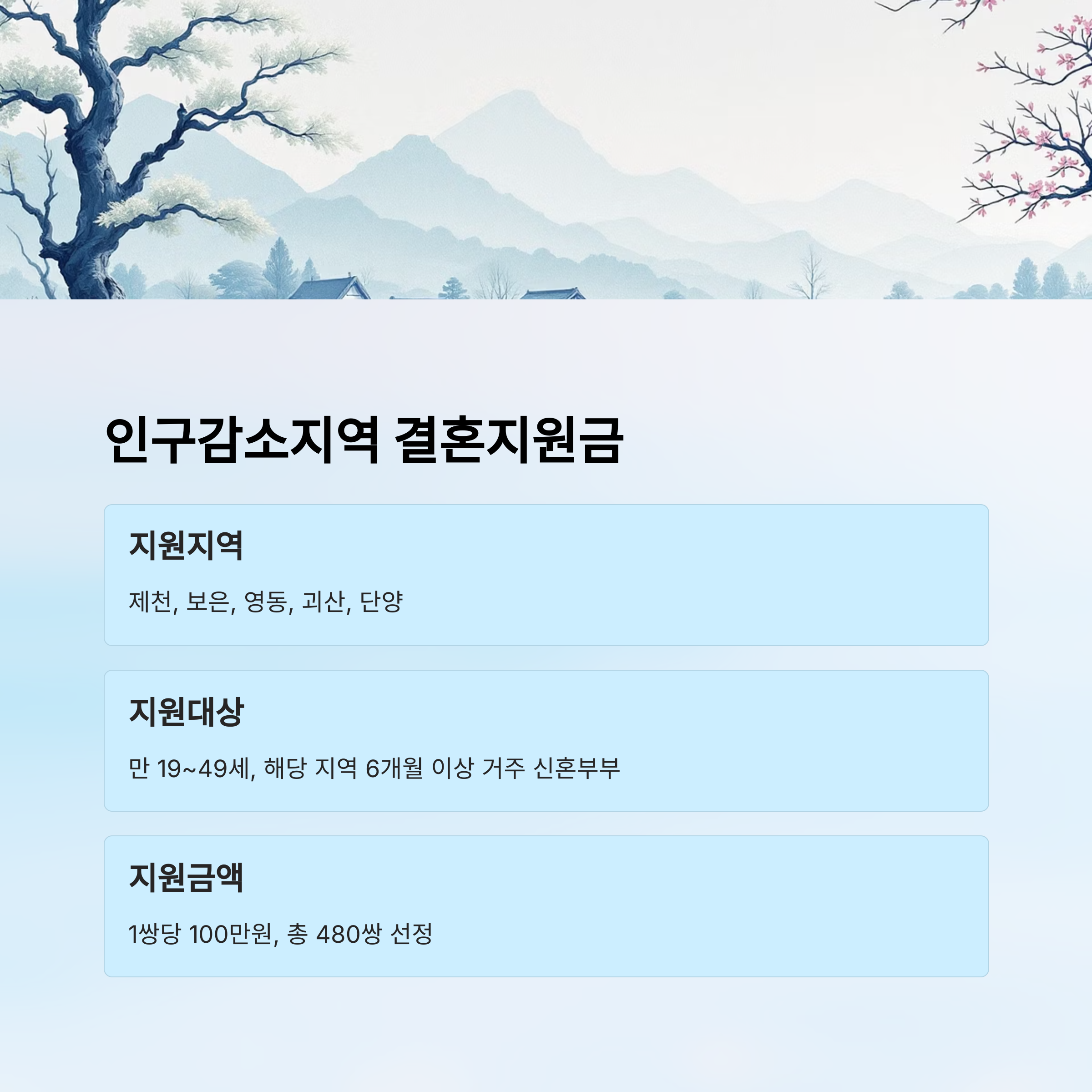 충청북도는 지방 소멸 위기를 막기 위해 인구감소지역에 거주하는 청년 신혼부부에게도 결혼 지원금을 마련했어요. 이 제도는 단지 결혼을 축하하는 의미를 넘어, 지역에 장기적으로 정착할 수 있도록 유도하는 정책이랍니다.