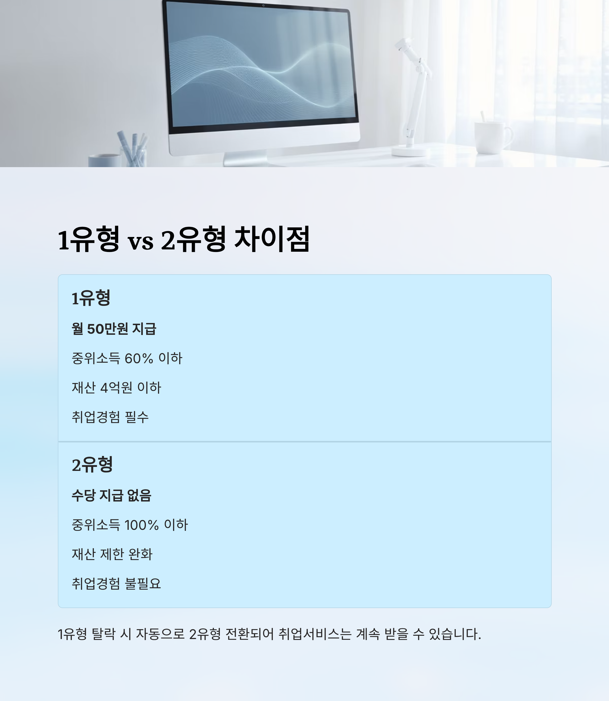 반면 2유형은 상대적으로 자격 요건이 유연해요. 수당은 지급되지 않지만, 직업훈련, 일자리 알선, 이력서 첨삭, 진로상담 같은 다양한 취업지원 서비스를 받을 수 있답니다. 특히 특정 취약계층에게는 매우 유익해요.
