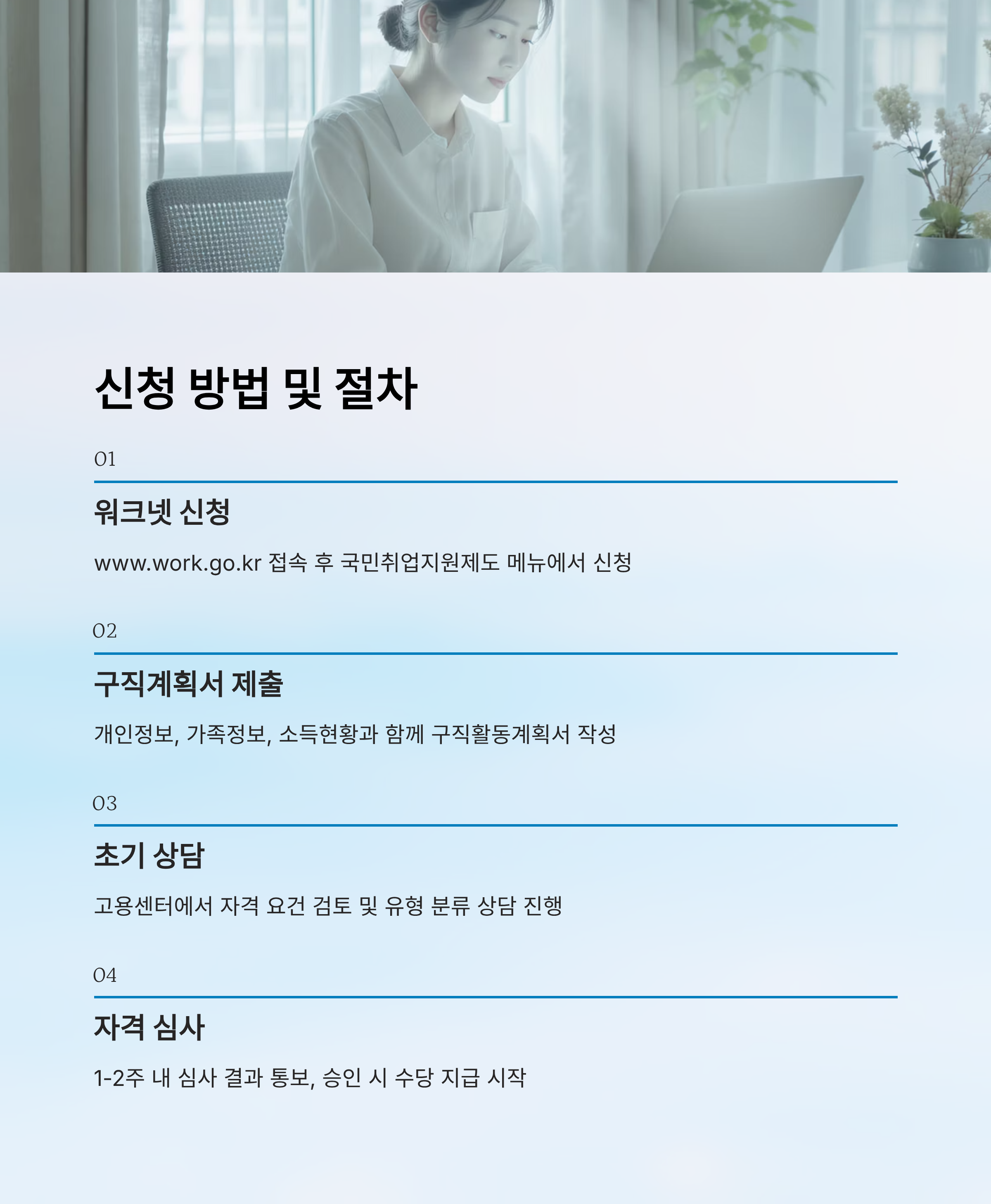 또한 구직 의지가 명확해야 해요. 아무리 소득 조건을 만족하더라도 “나는 그냥 수당만 받고 싶어”라는 자세라면 자격 심사에서 탈락할 수 있어요. 초기상담과 구직활동계획서를 통해 의지를 확인해요.