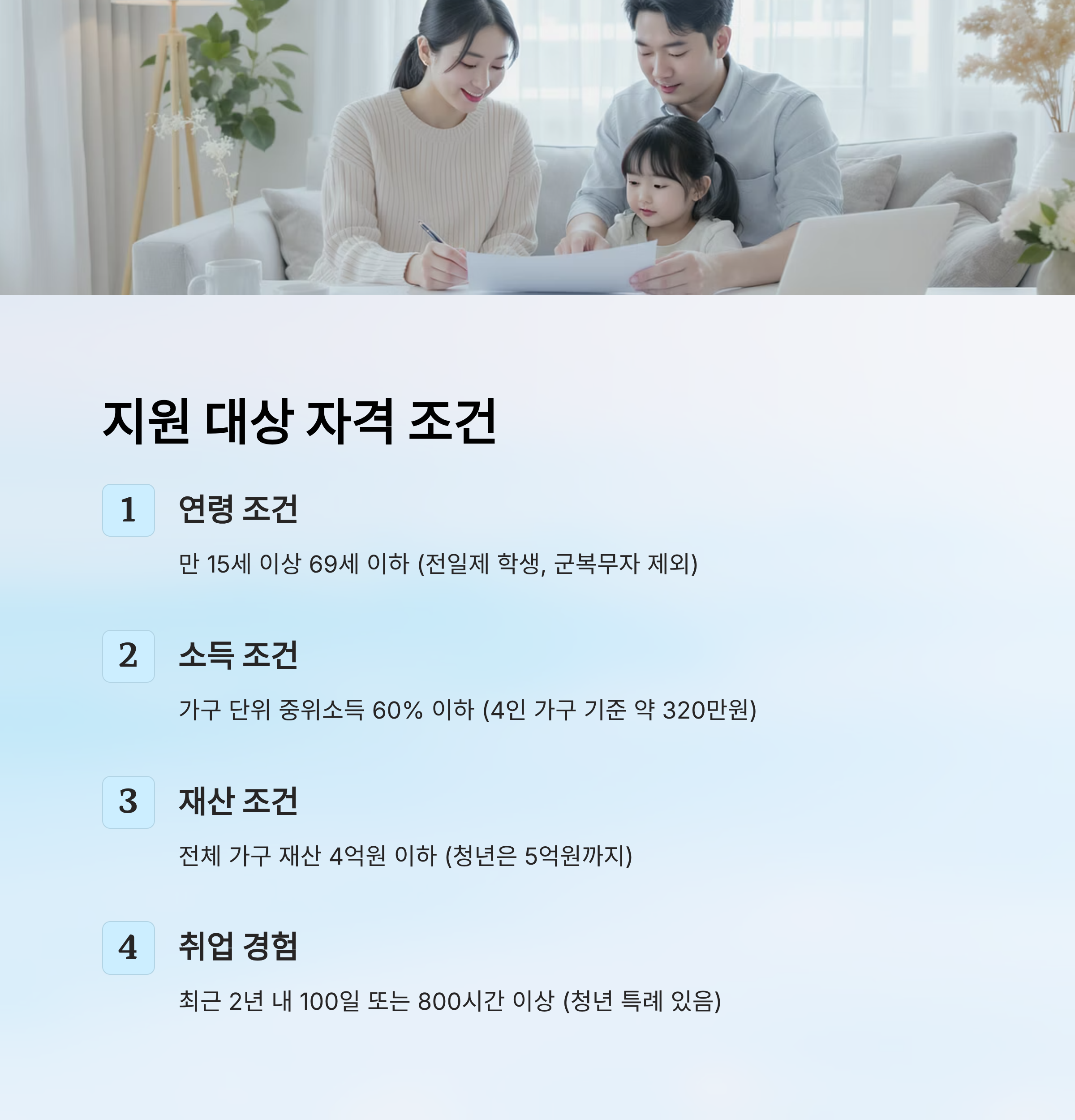 2025년 기준으로 가구 중위소득 60% 이하인 만 15세부터 69세까지의 구직자는 대상이 될 수 있어요. 추가로 부양가족 수에 따라 가산금이 붙기도 해서 가족이 있는 구직자에겐 더 도움이 되죠.