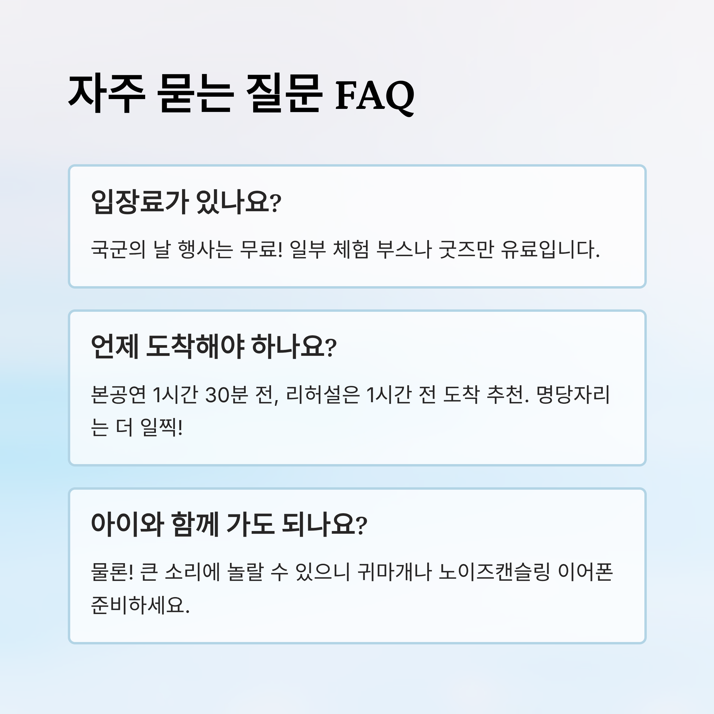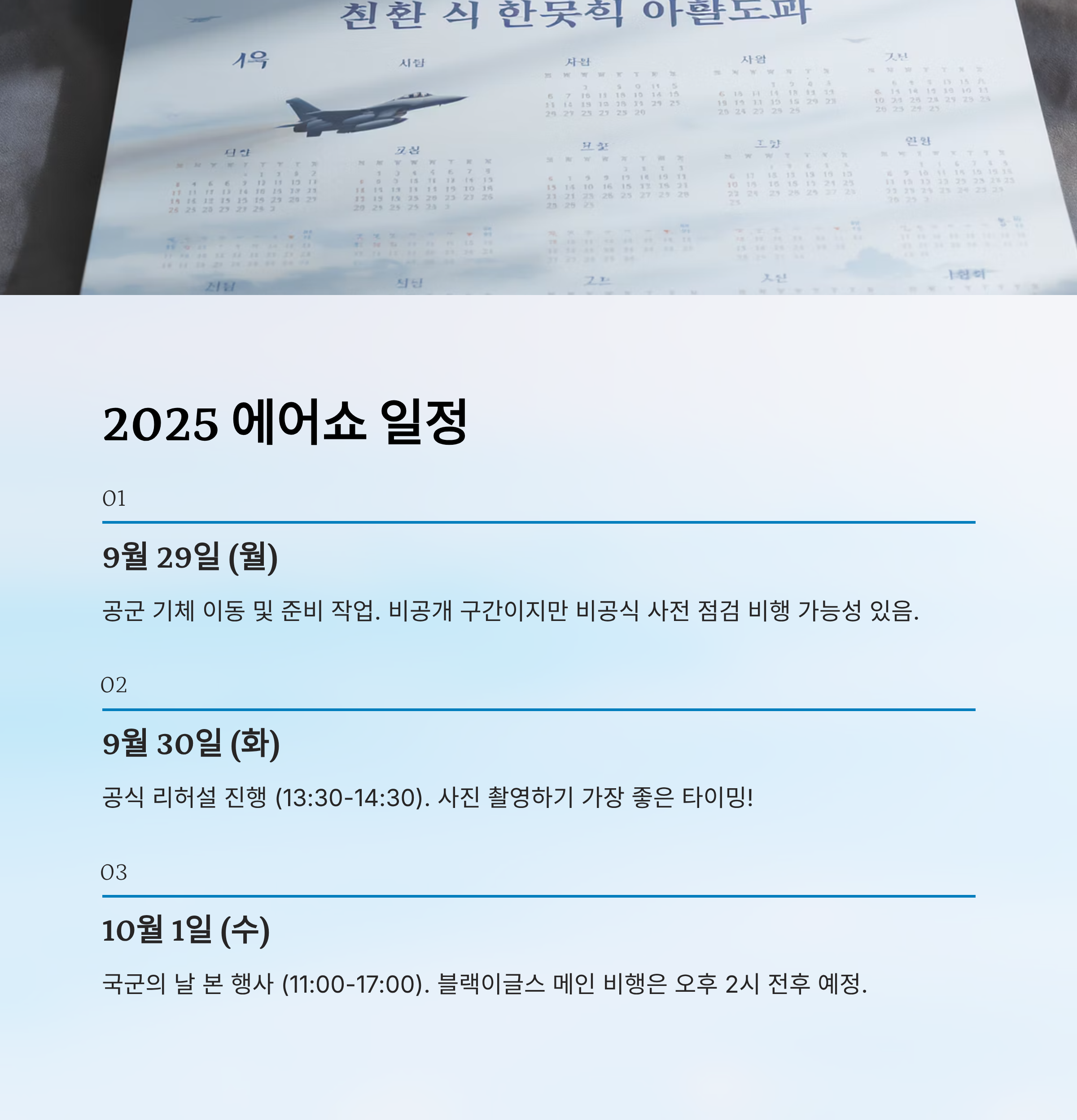 ※ 본 콘텐츠는 2025년 9월 기준 정보에 따라 작성되었으며, 이후 군 당국의 일정 변경이나 기상 등 외부 요인에 따라 내용이 달라질 수 있어요. 반드시 공식 홈페이지나 공지사항을 통해 최신 정보를 확인해 주세요.