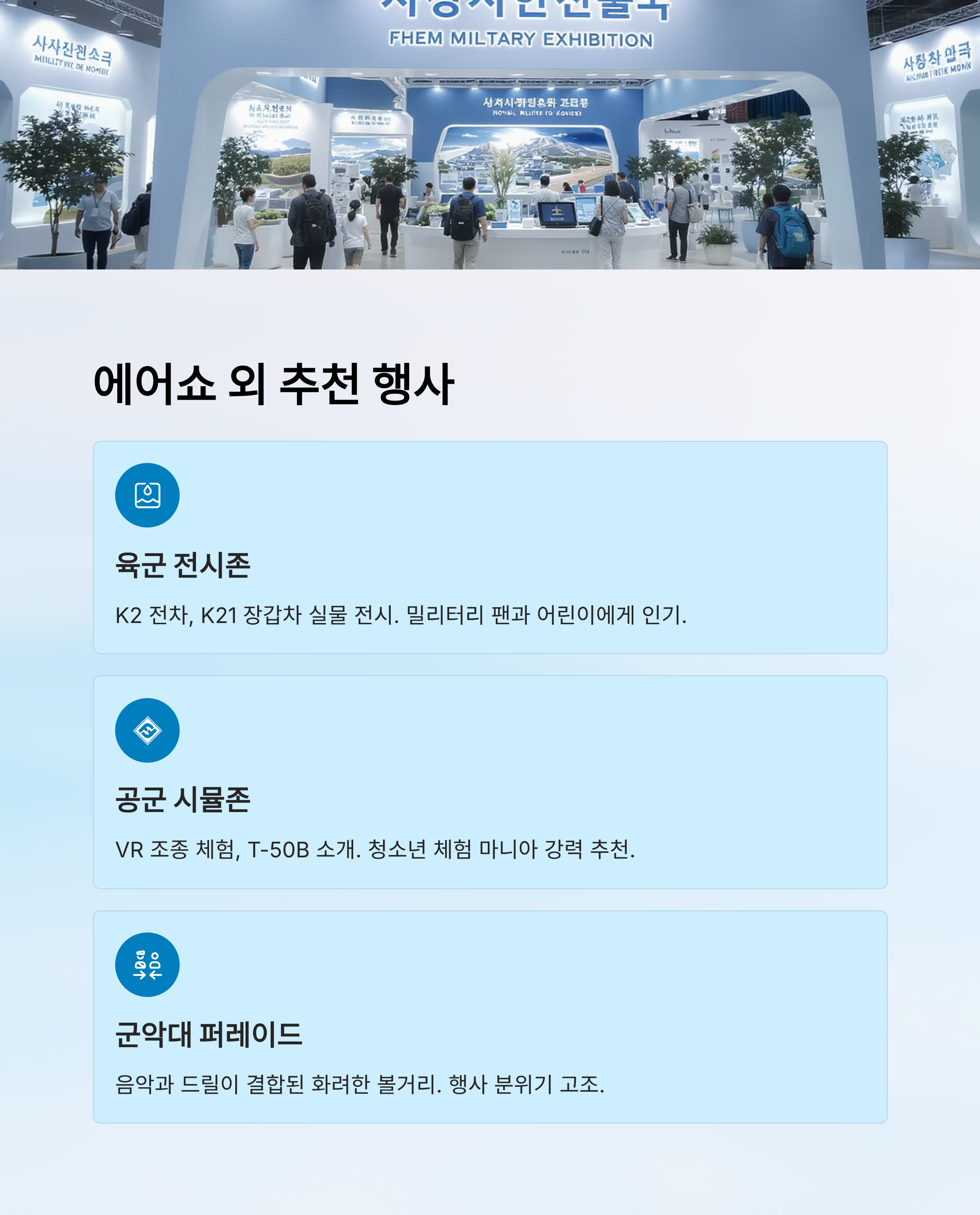 특히 가족 단위나 아이들과 함께 방문하는 분들에게는 군 장비 체험이나 기념 사진 촬영 부스가 인기 만점이에요. 군인 아저씨들과 찍는 사진은 평생의 추억이 된답니다. 📸