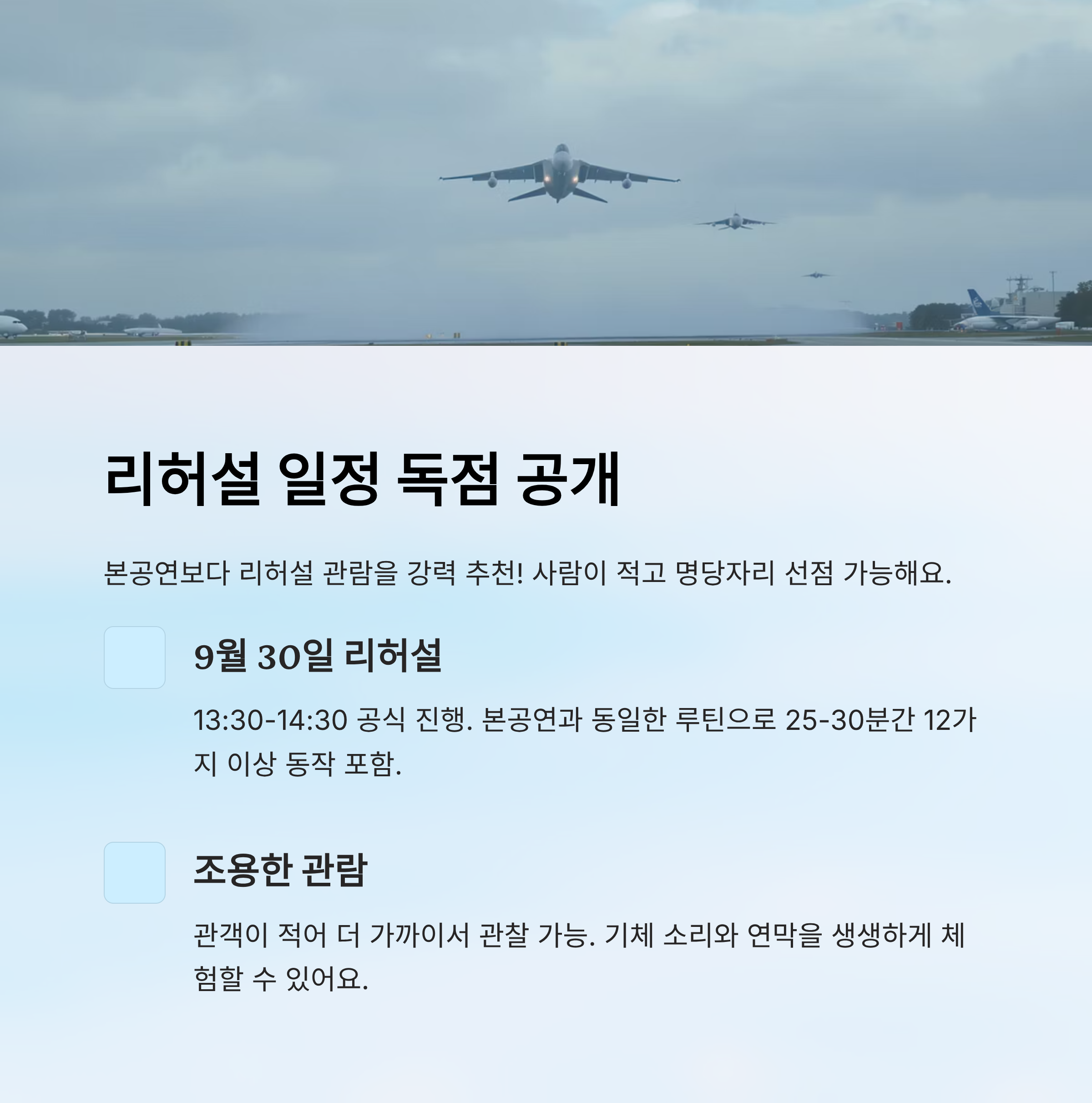 에어쇼를 200% 즐기려면 시간표, 위치 선정, 준비물까지 꼼꼼히 챙기는 게 정말 중요해요. 특히 리허설을 보는 건 마치 비밀 무대를 몰래 훔쳐보는 느낌이라 색다른 재미가 있죠! 자, 지금부터 하나씩 공략법을 알려줄게요! ✈️