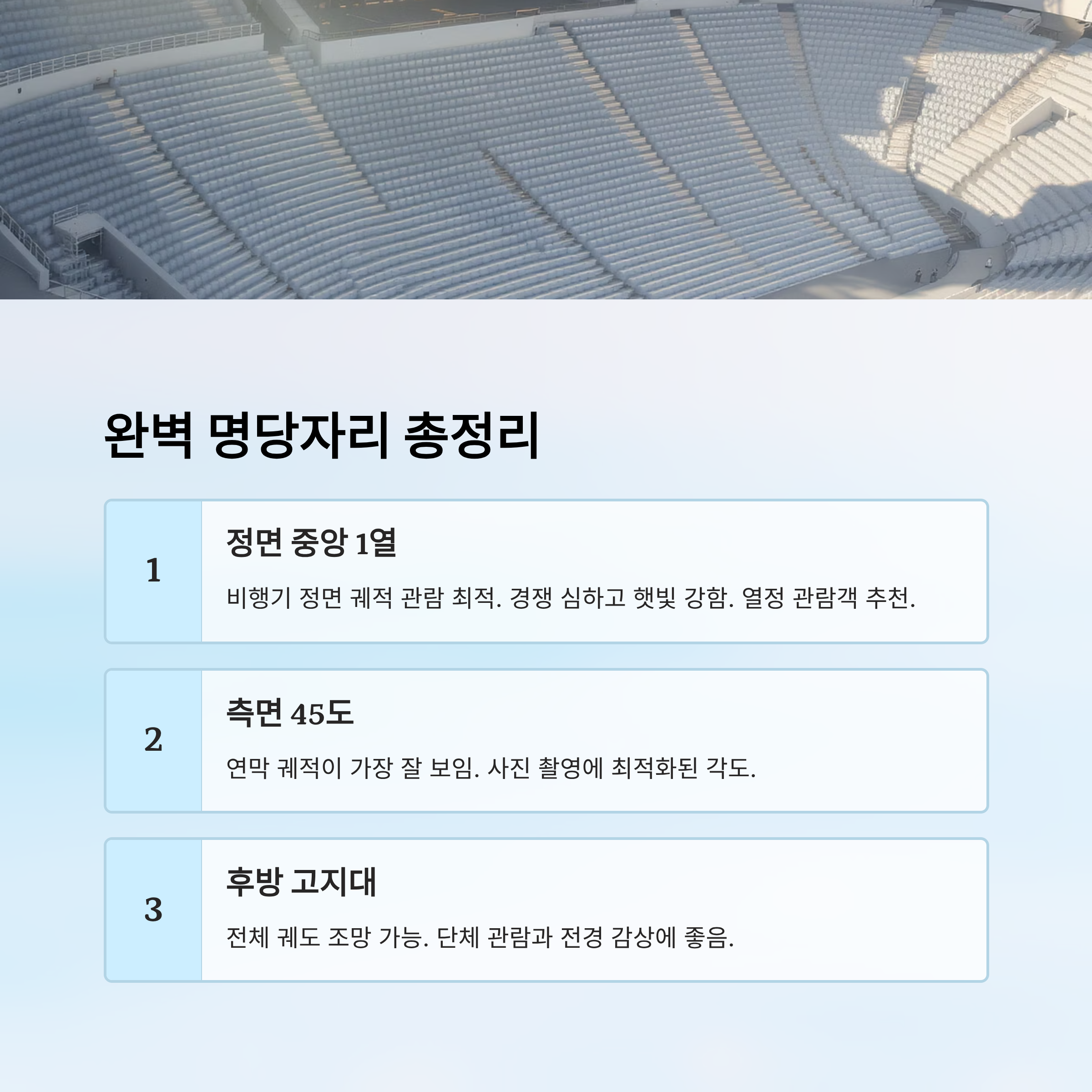 | 정면 중앙 1열 | 비행기 정면 궤적 관람 | 경쟁 심함, 햇빛 강함 | 열정 관람객 |