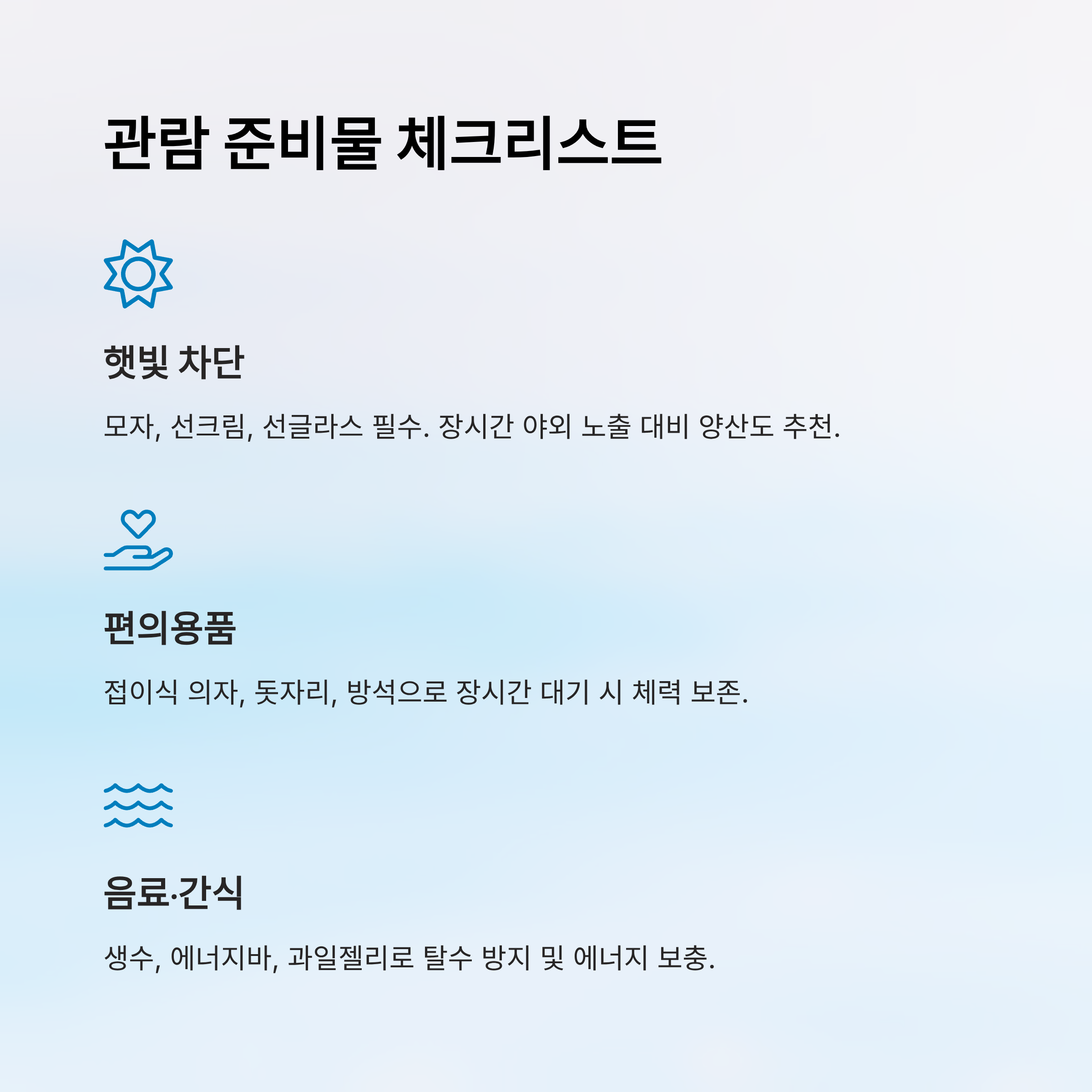 블랙이글스 에어쇼는 단순히 멋진 비행만 보는 게 아니라, 실제로 현장에서 '버티는 싸움'이기도 해요. 장시간 노출되는 야외 환경 속에서 쾌적하게 즐기려면 미리 준비해야 할 것들이 꽤 많답니다! 🧢