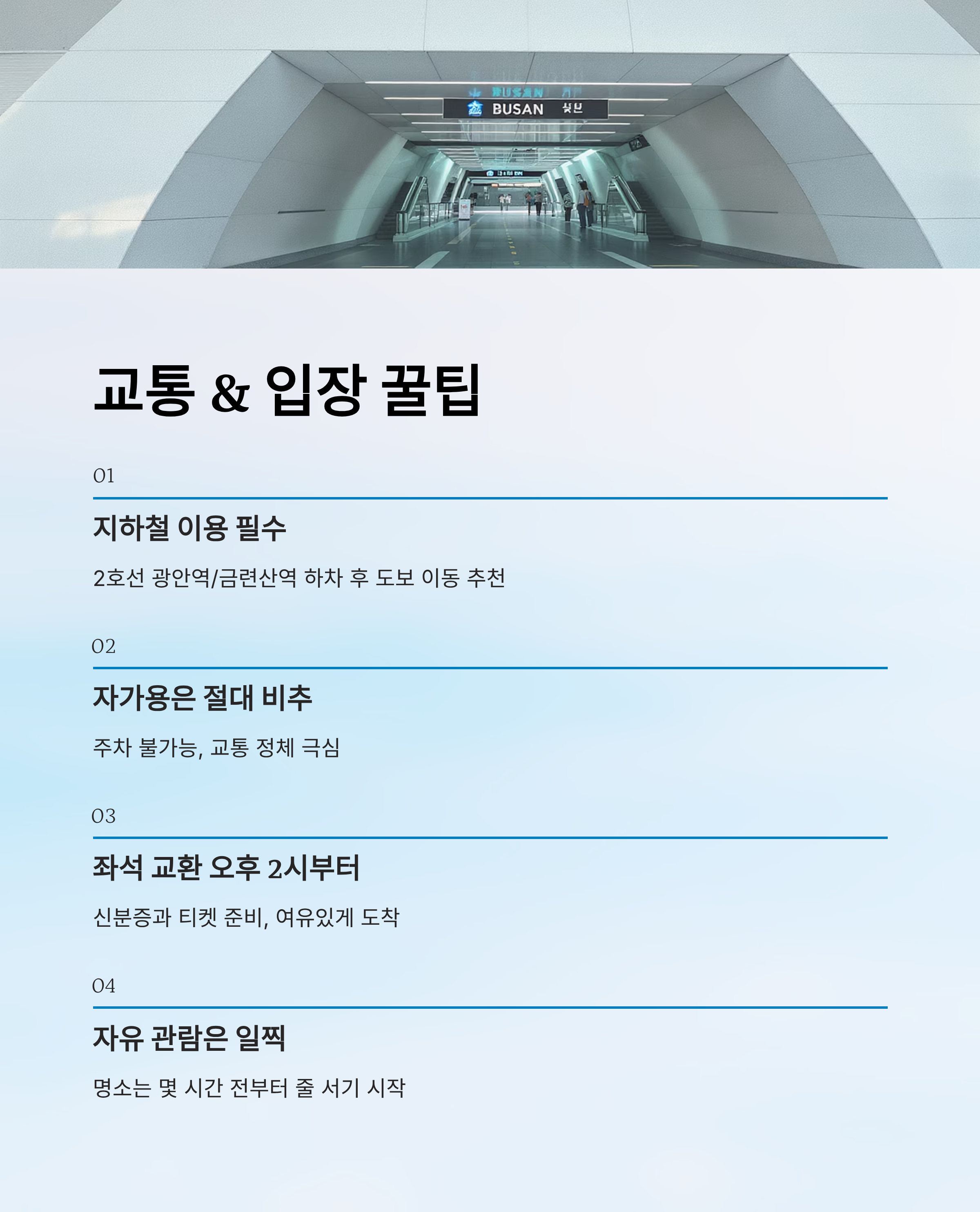 축제 당일엔 상상을 초월할 정도로 교통이 혼잡해져요. 그래서 가장 추천하는 방법은 대중교통 이용이에요! 특히 지하철 2호선 ‘광안역’ 또는 ‘금련산역’에서 도보로 이동하는 것이 효율적이에요.