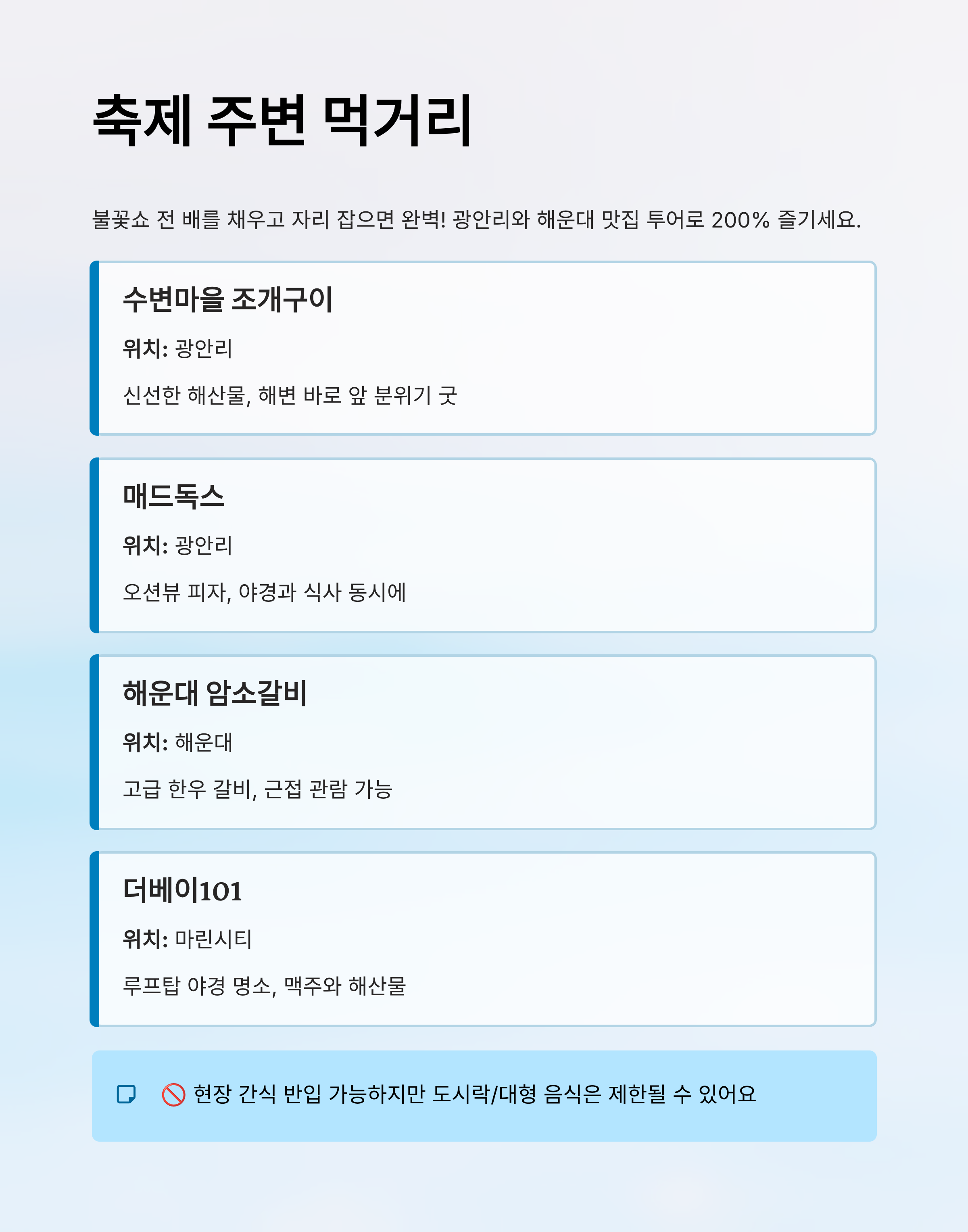 부산불꽃축제를 200% 즐기려면 먹거리도 빼놓을 수 없죠! 광안리 주변은 먹방 투어 명소로도 손색이 없을 정도예요. 불꽃쇼 시작 전에 가볍게 배를 채우고 자리 잡으면 최고예요. 😋