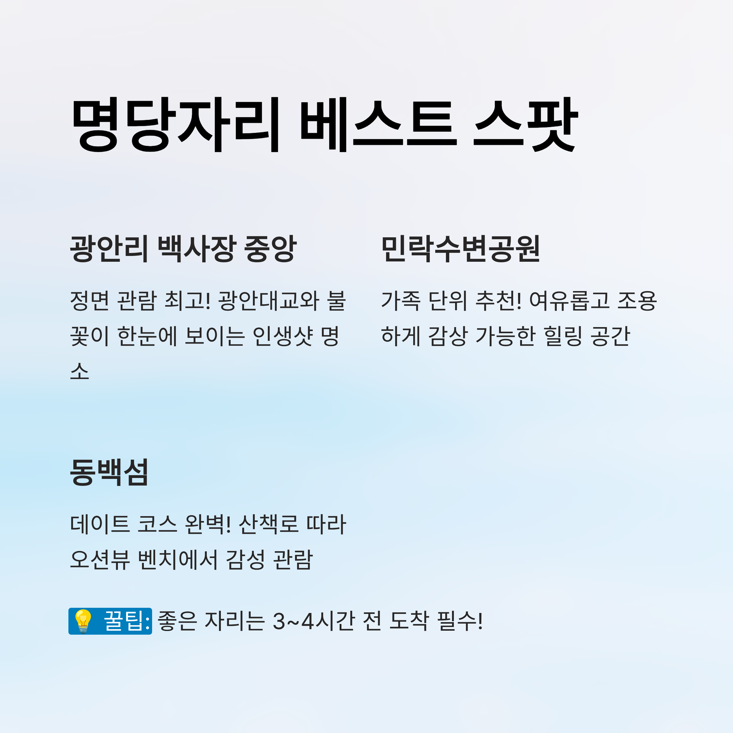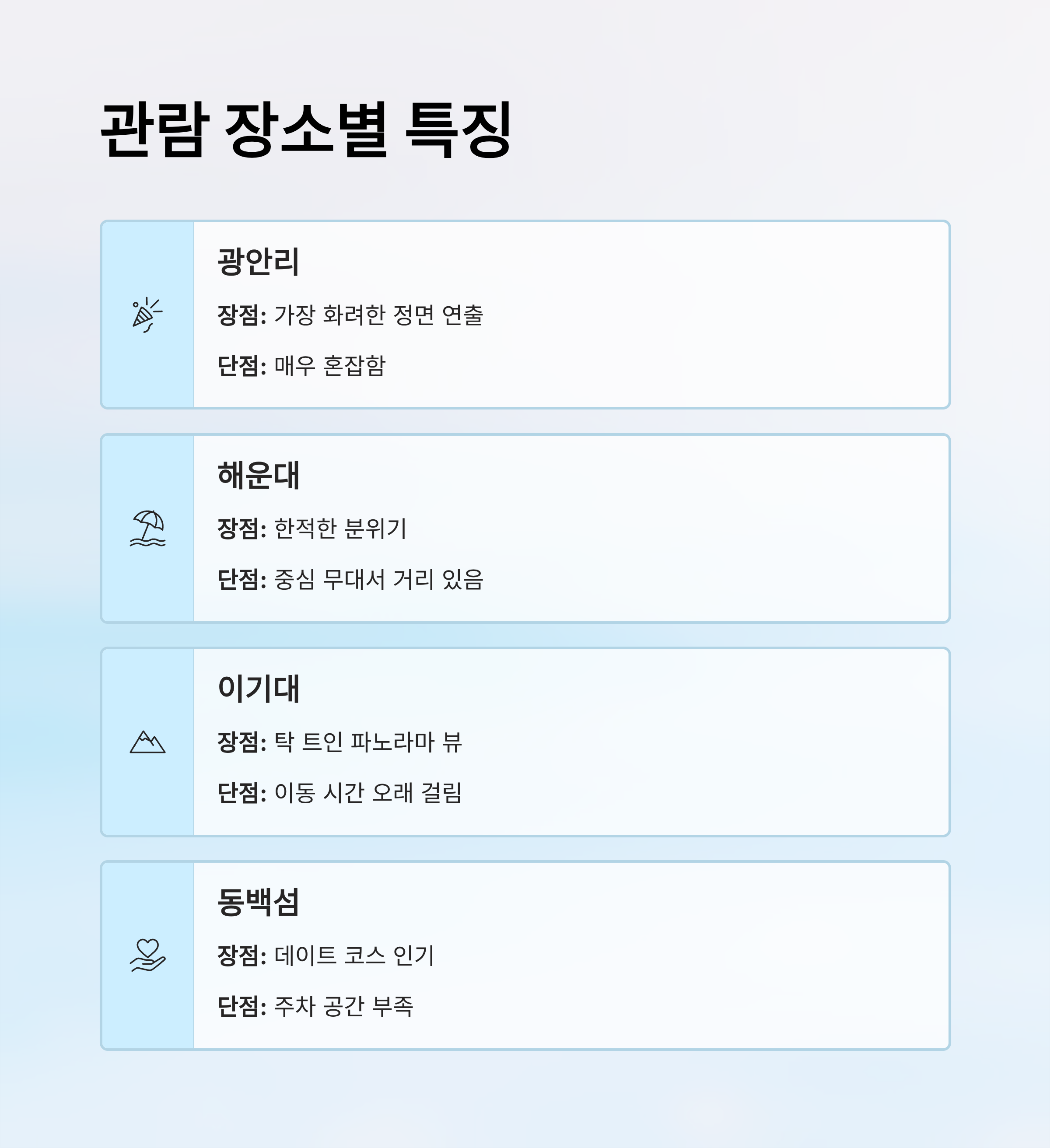 각 지역마다 분위기와 뷰가 달라서, 나에게 맞는 장소를 선택하는 게 중요해요. 분위기 있게 불꽃을 즐기고 싶다면 동백섬, 박력 있는 연출을 원한다면 광안리를 추천해요! 💥