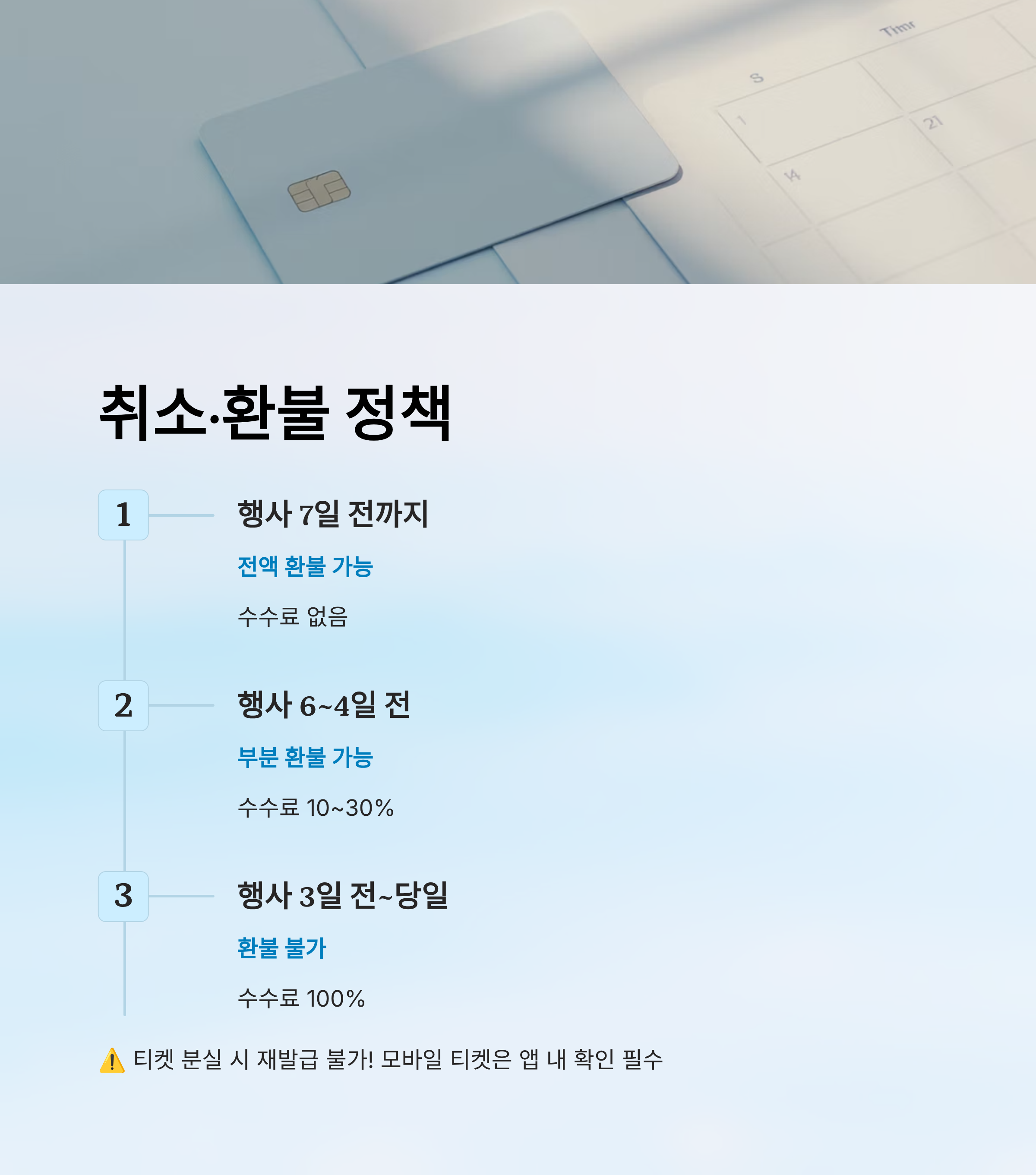 또한 티켓 분실 시 재발급은 불가하므로, 꼭 안전하게 보관해야 해요. 특히 모바일 티켓은 캡처가 아닌 앱 내 확인이 원칙이에요. 당일 현장에서는 환불/변경 절대 안 되니 유의하세요! 🔒