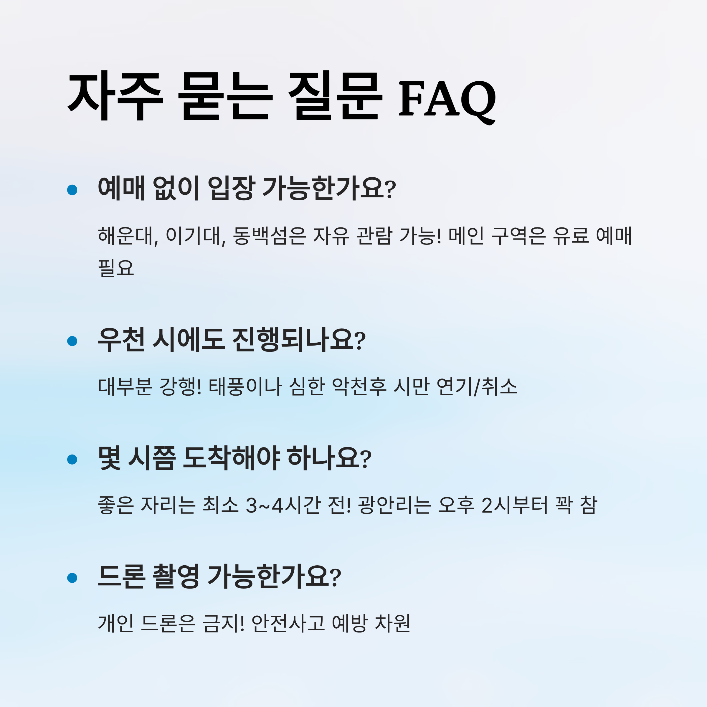 | 자유관람 | 무료 | 별도 좌석 없음 | 광안리 외 지역 | 선착순 |