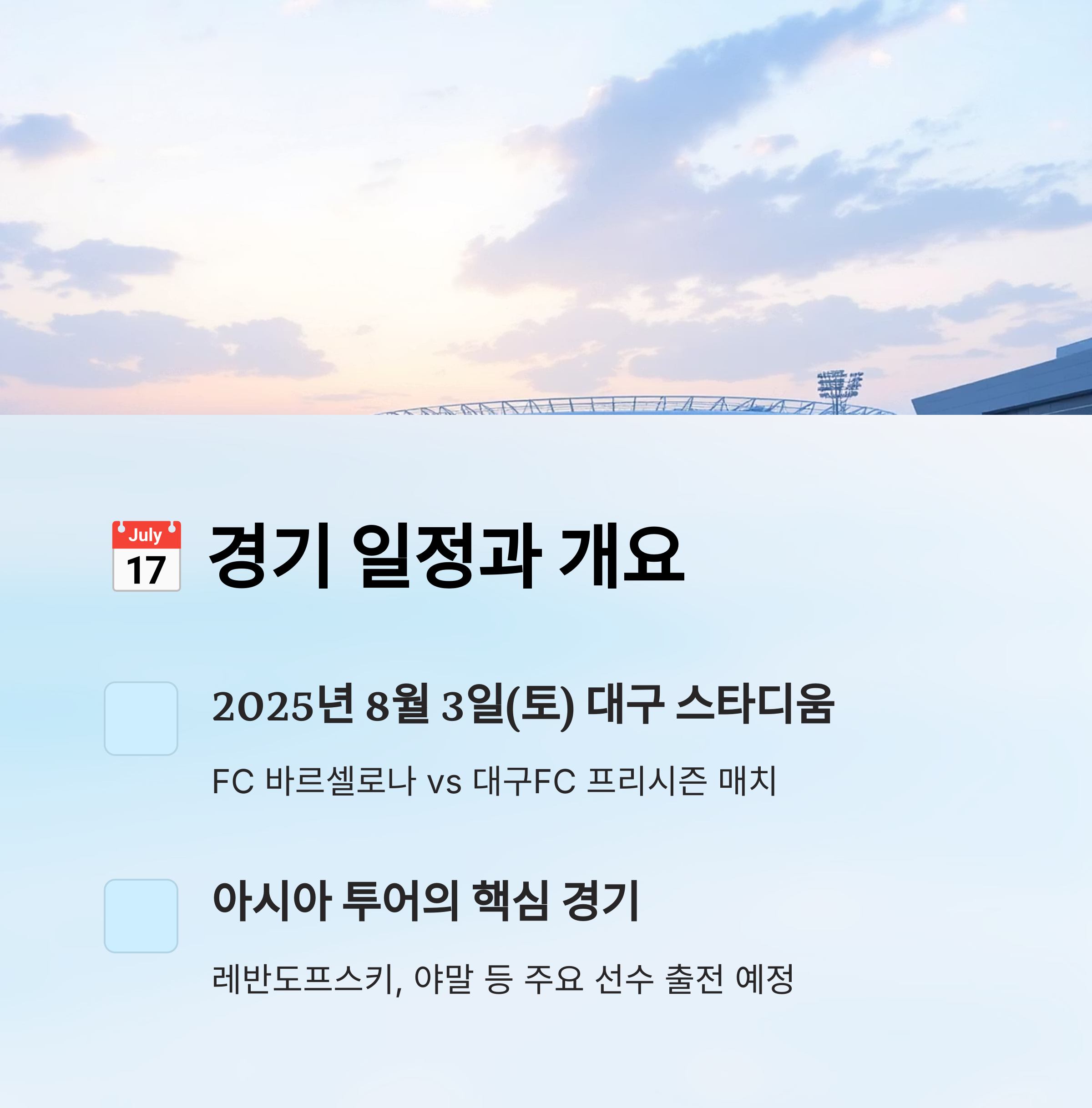 또한 대구FC 공식 홈페이지를 통한 지역 팬 대상 판매, FC 바르셀로나 공식 홈페이지를 통한 해외 패키지 티켓도 열릴 수 있으니 다양한 루트를 열어두는 게 좋아요. 🌍