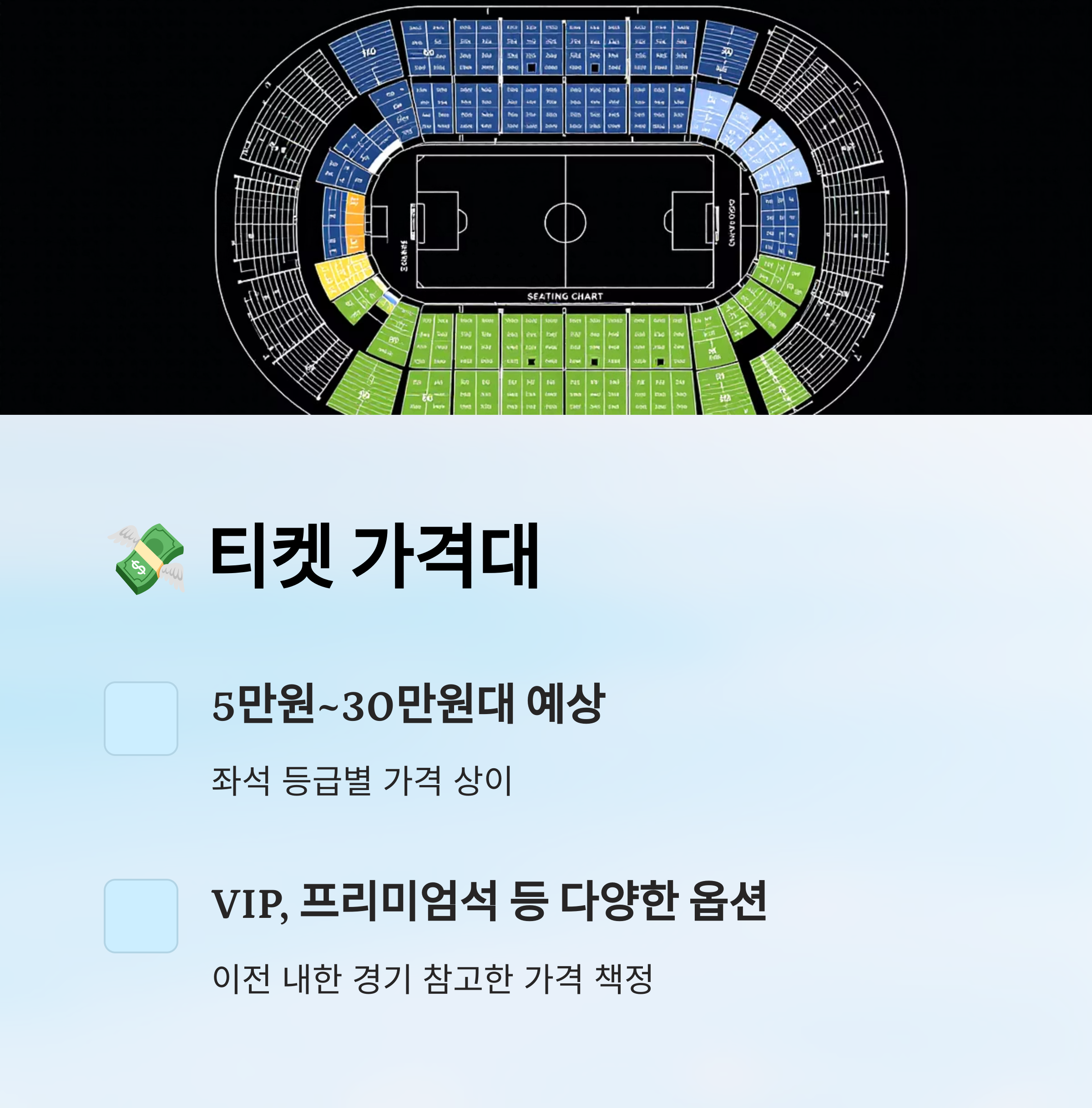 응원석(골대 뒤쪽)은 5만~8만 원 선이지만, 열정 가득한 분위기를 느끼고 싶다면 정말 좋은 선택이에요. 🎉