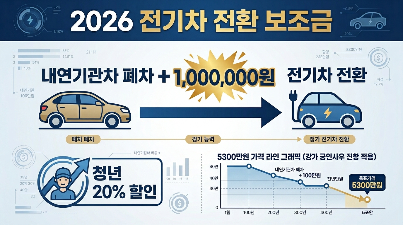 안녕하세요! 요즘 부쩍 높아진 기름값과 야금야금 들어가는 노후차 수리비 때문에 전기차로 갈아탈까 고민 중인 분들 많으시죠? 😊 저도 작년에 10년 탄 차를 보내주려다 보조금 계산기만 두드리다 포기했던 기억이 나는데요. 하지만 2026년인 올해는 이야기가 완전히 달라졌습니다! 정부가 환경 오염의 주범인 오래된 차를 전기차로 바꾸는 분들에게 '전환지원금'이라는 이름으로 100만 원을 더 얹어주기로 했거든요. 단순히 보조금을 받는 것을 넘어, 내 차를 어떻게 처분하느냐에 따라 지원금 앞자리가 바뀌는 시대가 왔습니다. 오늘은 전기차 구매를 고민하는 분들이라면 반드시 알아야 할 2026년형 보조금 꿀팁을 팩트 체크와 함께 아주 자세히 풀어보겠습니다! ✨