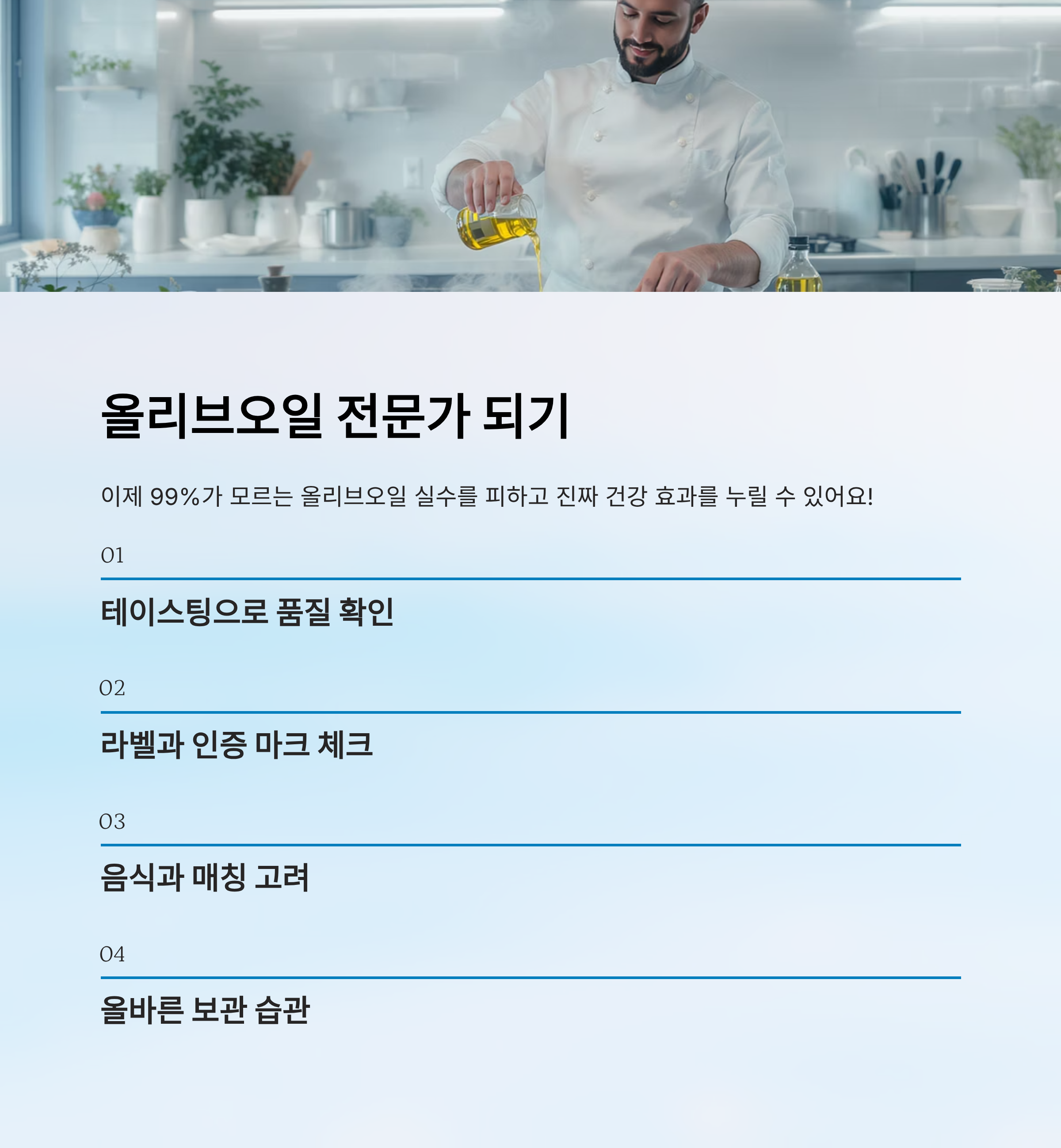 이제 올리브오일을 현명하게 활용해 진짜 전문가처럼 보일 수 있는 방법을 알려드릴게요. 다음은 ‘올리브오일 전문가 되는 법’이에요 ✨
