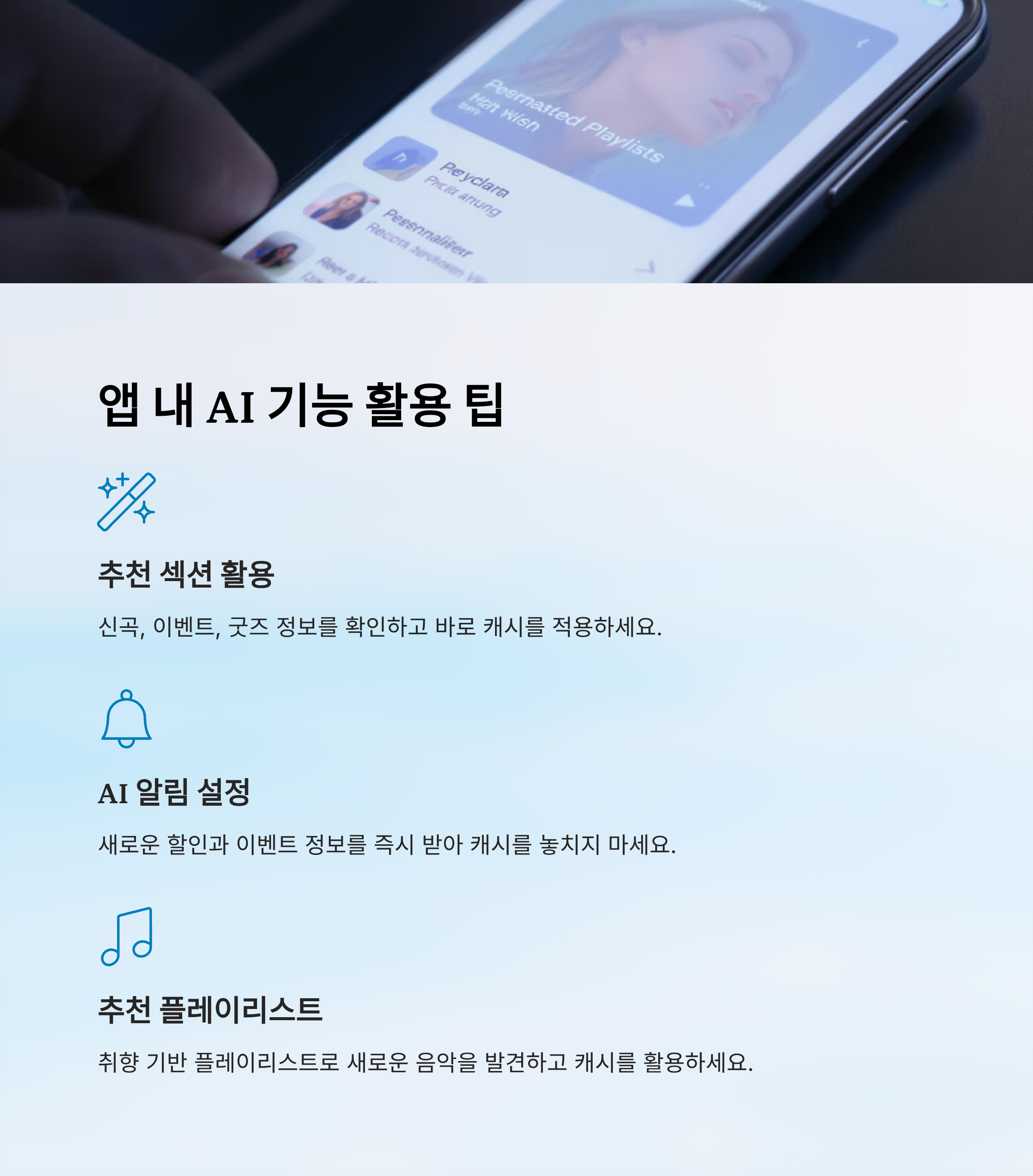 앱 내 AI 기능을 적극 활용하면, 단순히 캐시를 사용하는 것 이상으로 음악 경험과 소비 효율이 동시에 개선돼요. 특히 이벤트와 할인 정보를 즉시 확인할 수 있는 점이 큰 장점이에요.