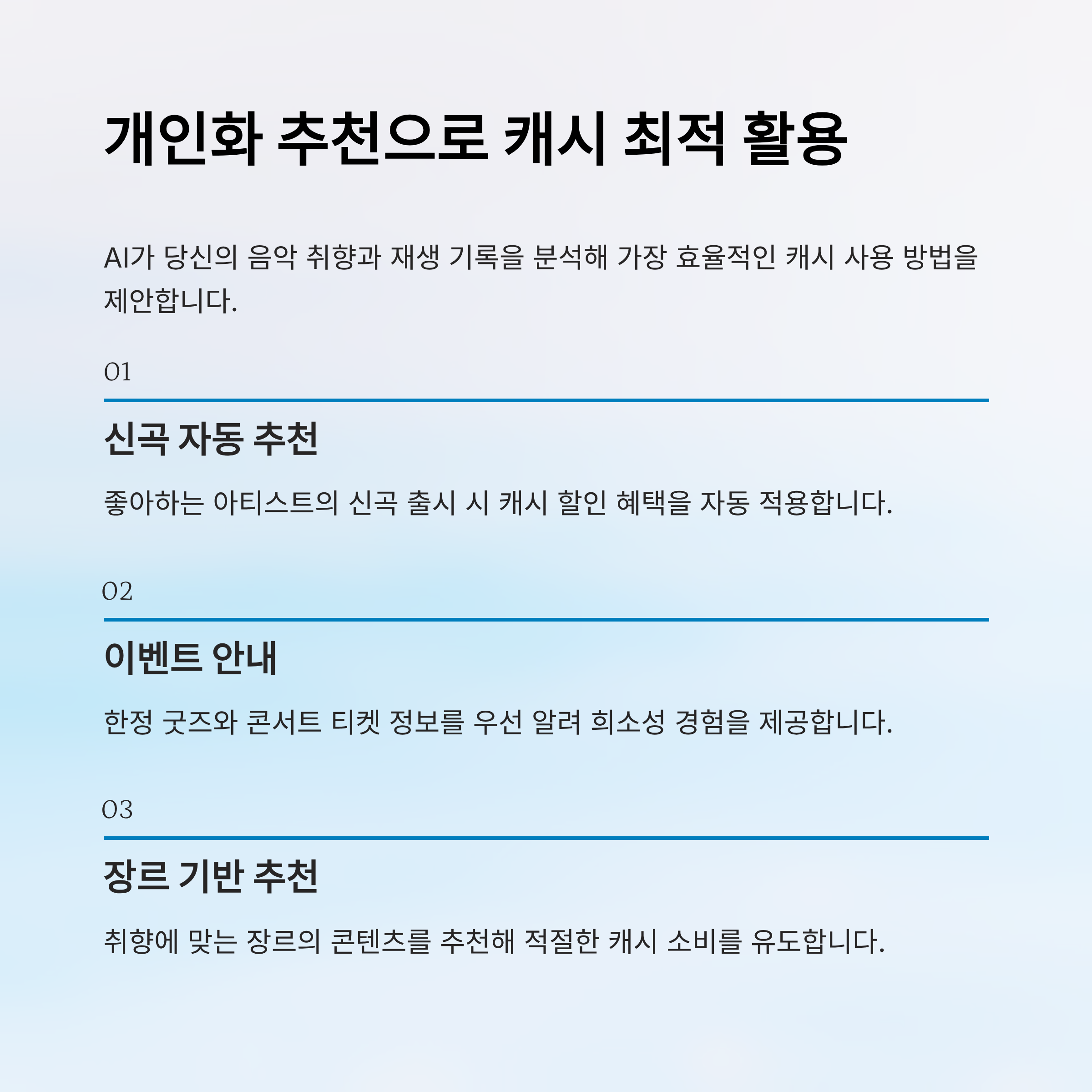 AI 개인화 추천은 단순히 음악 소비를 돕는 수준을 넘어, 사용자가 더 즐겁게 음악을 경험하도록 도와주는 역할도 해요. 반복적인 선택 고민 없이 최적의 캐시 활용 경로를 제공하니, 음악 생활이 훨씬 편리해져요.
