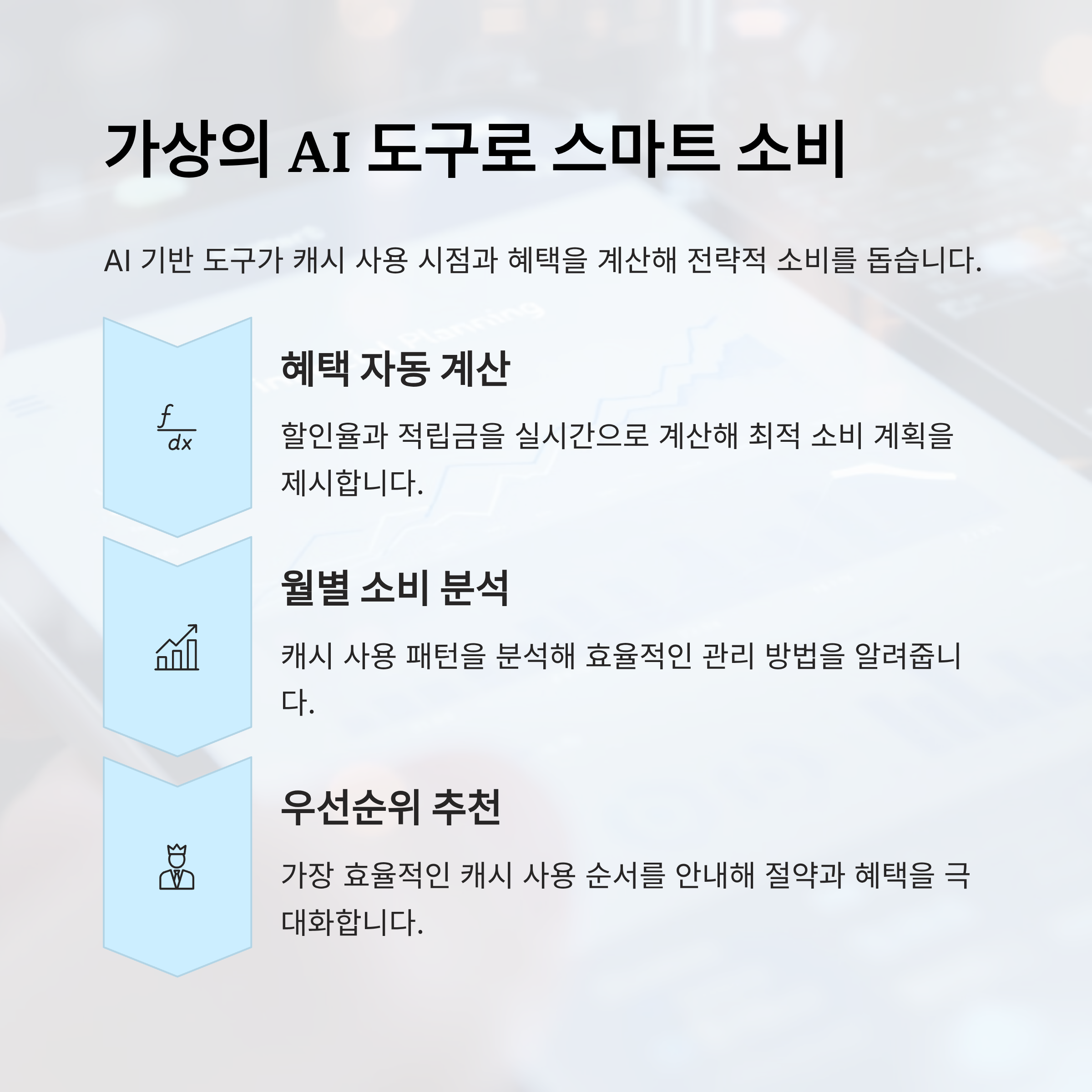 | 혜택 계산 | 할인율, 적립금 자동 계산 | 최적 소비 계획 |
