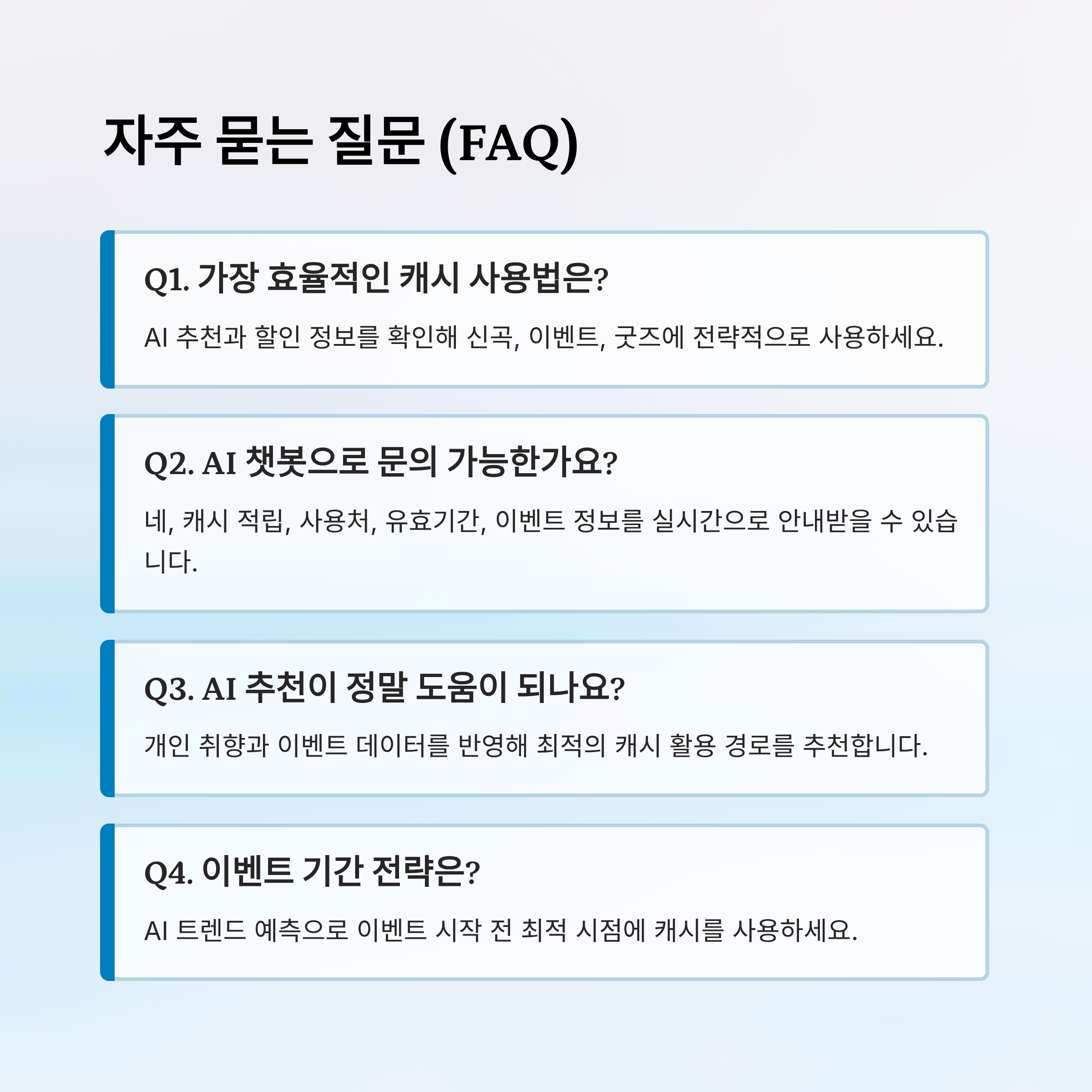 A5. AI가 제공하는 트렌드 예측을 활용하면 이벤트 시작 전 최적 시점에 캐시를 사용할 수 있어 혜택을 극대화할 수 있어요.