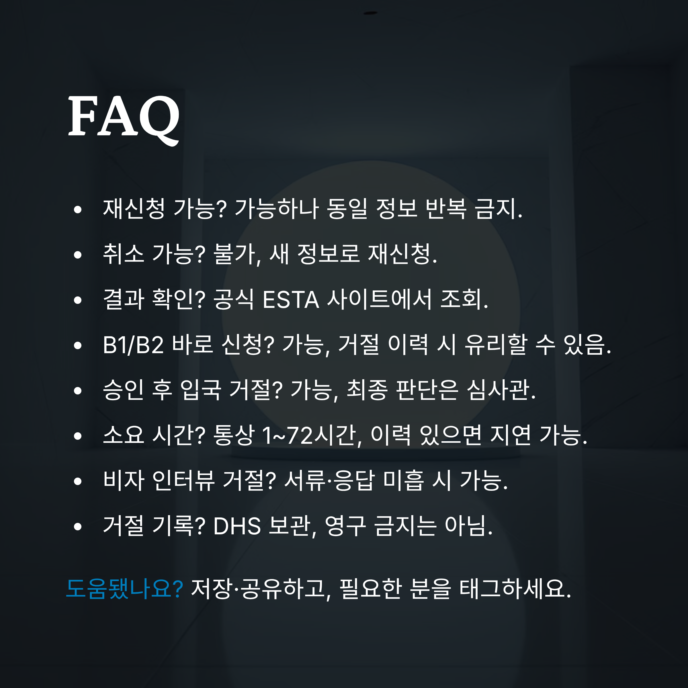 거절 사유가 시스템상의 오류나 단순한 실수였다면, 잘 수정한 후 재신청하는 게 좋지만, 과거 미국에서의 체류 이력, 보안 관련 이슈 등 구조적인 문제라면 B1/B2 관광/상용 비자로 전환하는 것이 훨씬 현실적인 선택이에요.