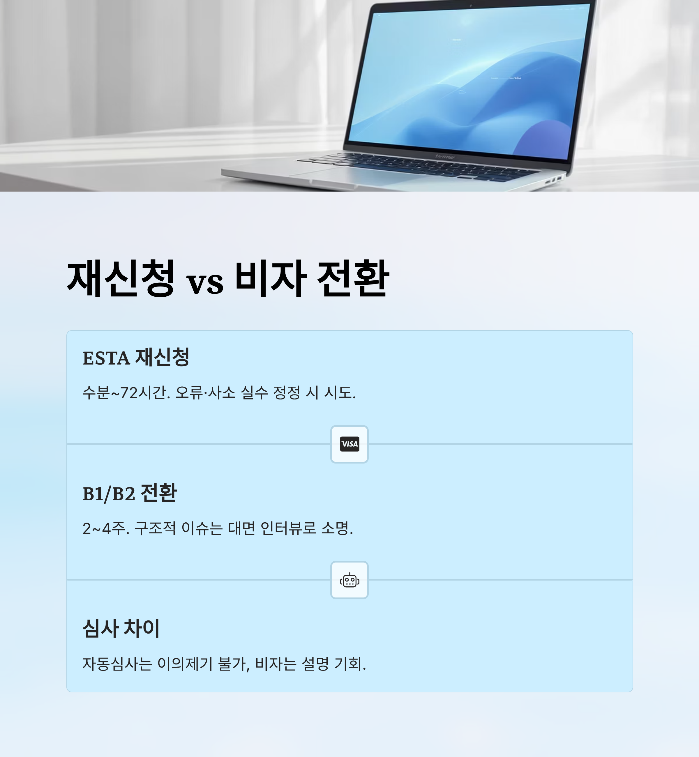 따라서 재신청을 무작정 시도하기보다는 먼저 ‘내가 왜 거절되었는가’를 분석하고, B1/B2 전환이 적절한지를 평가하는 게 전략적인 접근법이에요.