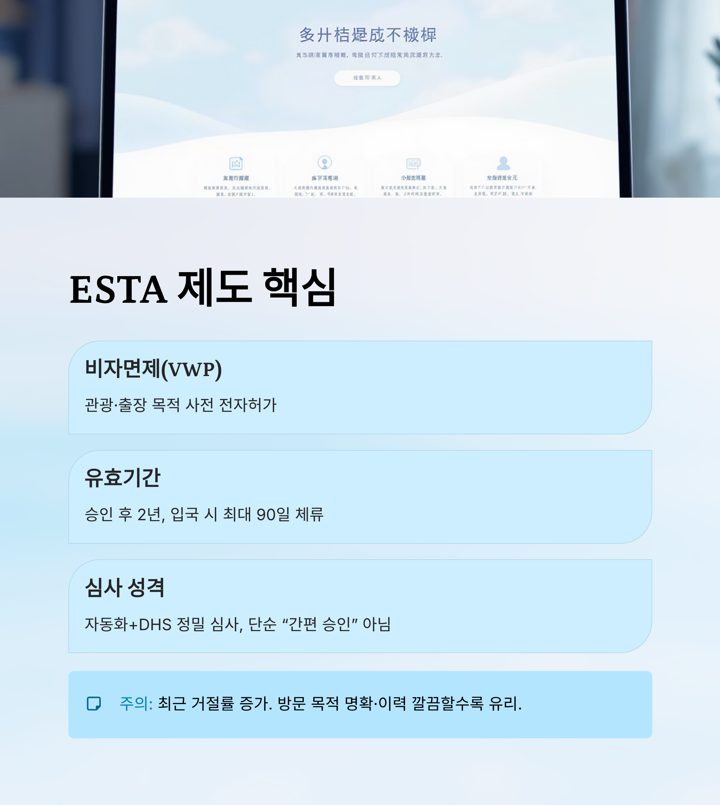 2025년 현재 미국 입국 심사 기준은 더욱 강화되는 추세예요. ESTA나 비자 모두 '명확한 여행 목적', '충분한 재정 상태', '한국으로 돌아올 확실한 이유'를 갖춘 신청자에게 유리하게 작용하고 있어요.
