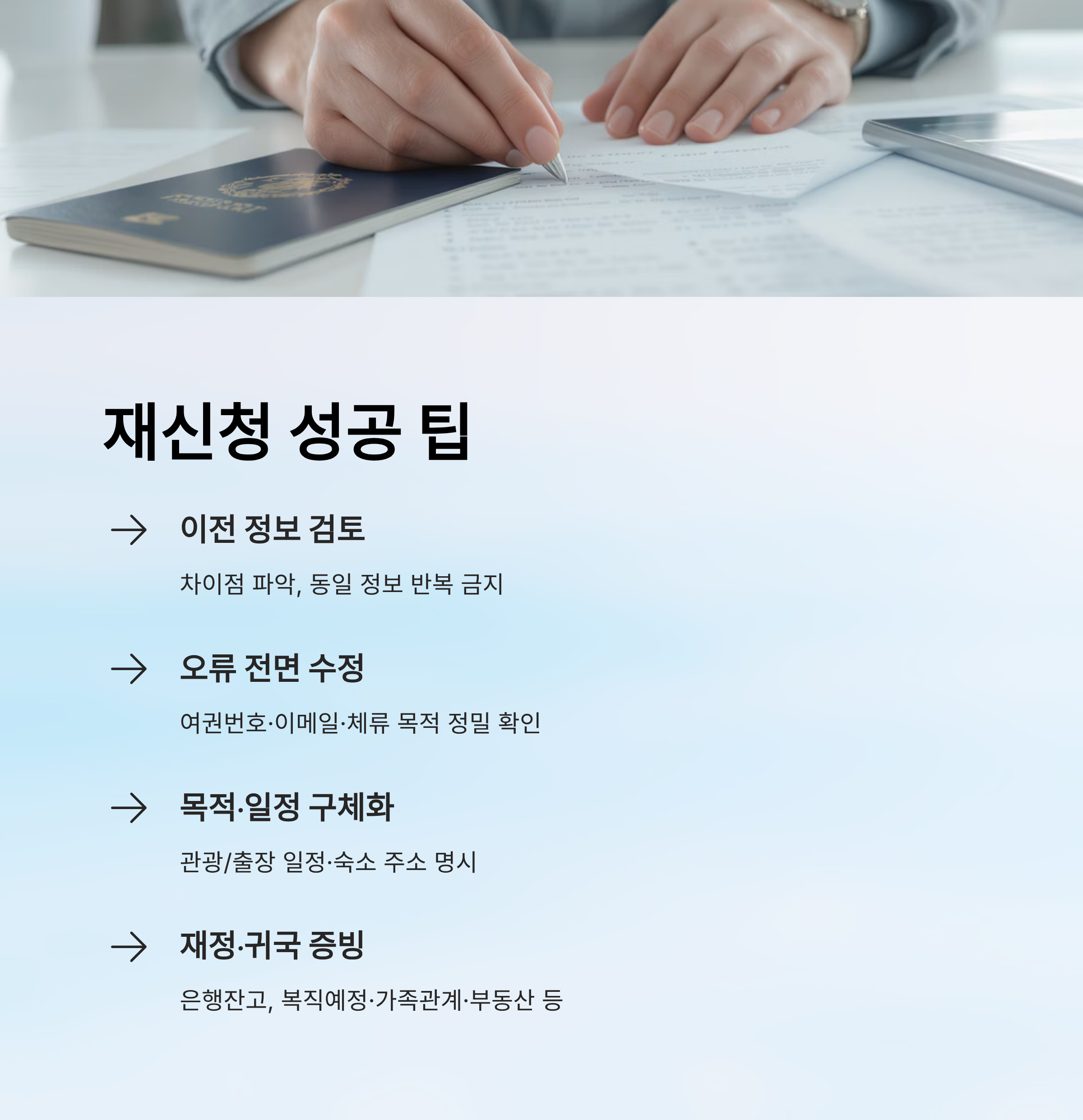 먼저 이전 신청 시 제출했던 정보를 복기해보고, 정확하게 어떤 부분에서 문제가 있었는지 확인해야 해요. 여권 유효기간이 충분한지, 항공권 정보가 명확했는지, 체류 목적이 구체적이었는지 등 꼼꼼하게 검토하는 게 중요하죠.